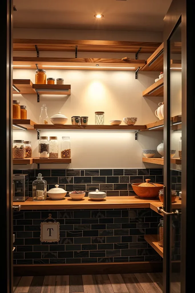 Floating shelves are an excellent unobtrusive storage solution that visually expands the pantry room. I especially like using them in tighter areas where conventional cabinetry would be considered bulky, and adds stylish underlighting. This stylistic flourish changes the feel of the space to warm and inviting while maintaining functional and stylish.