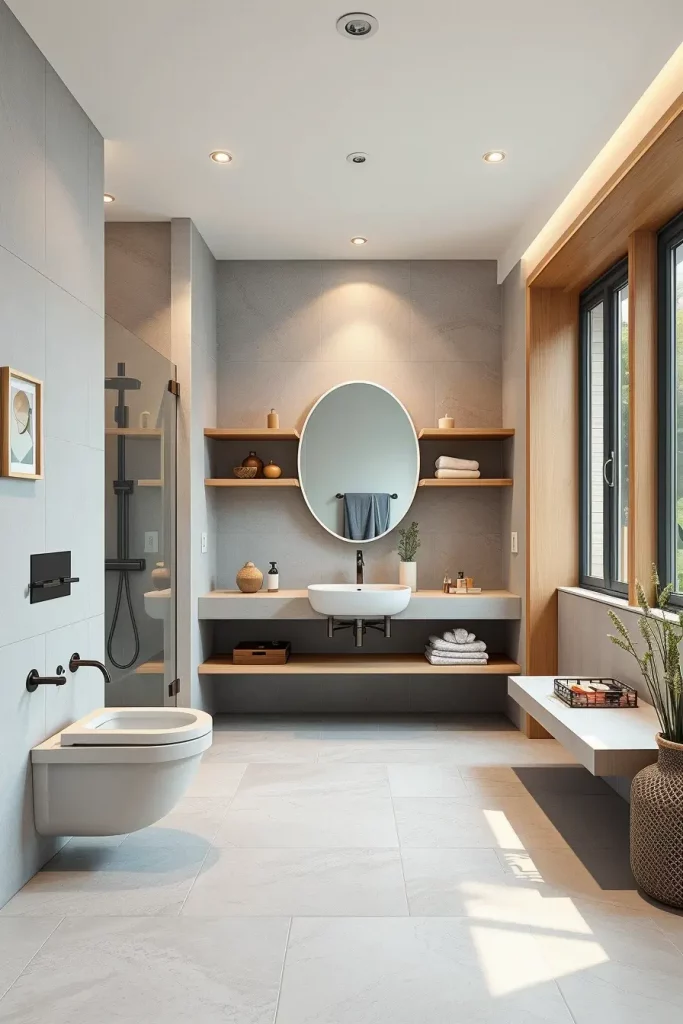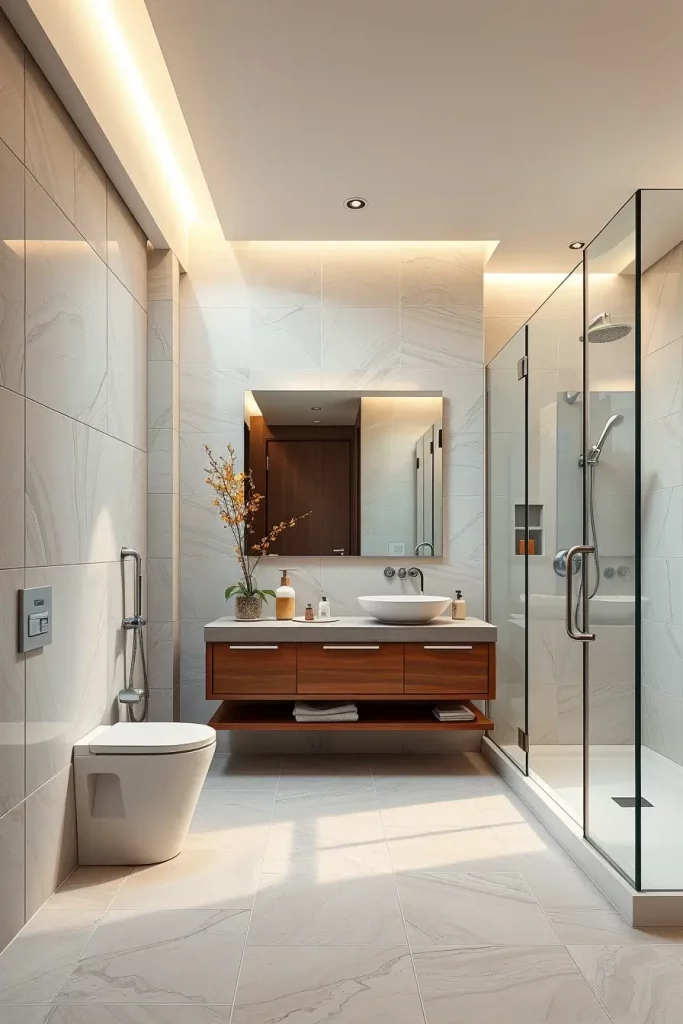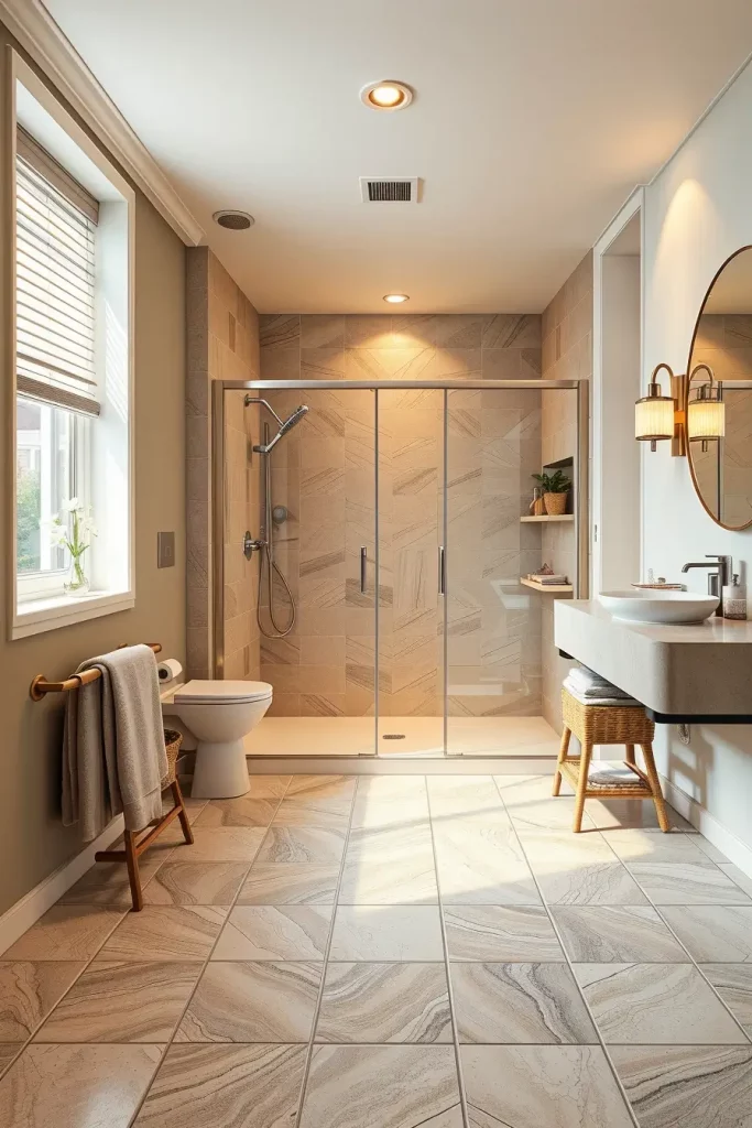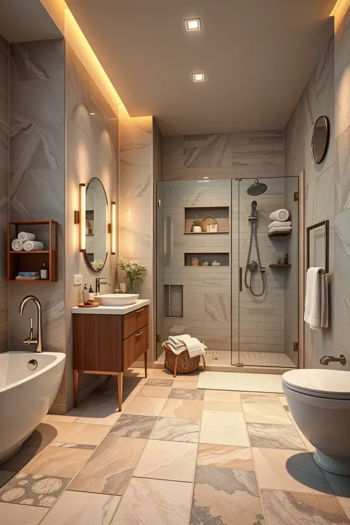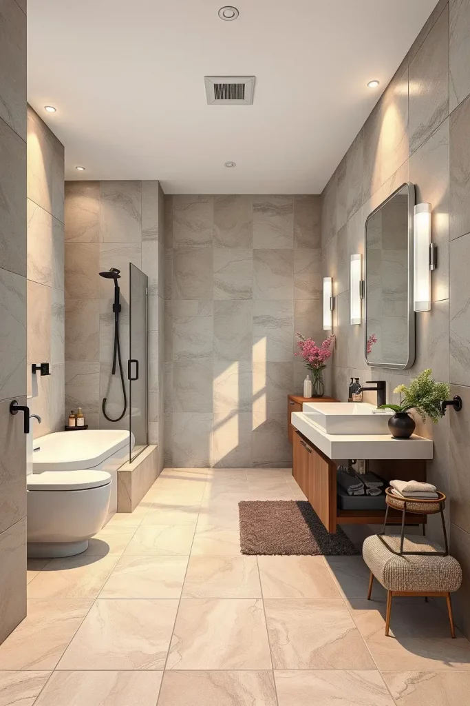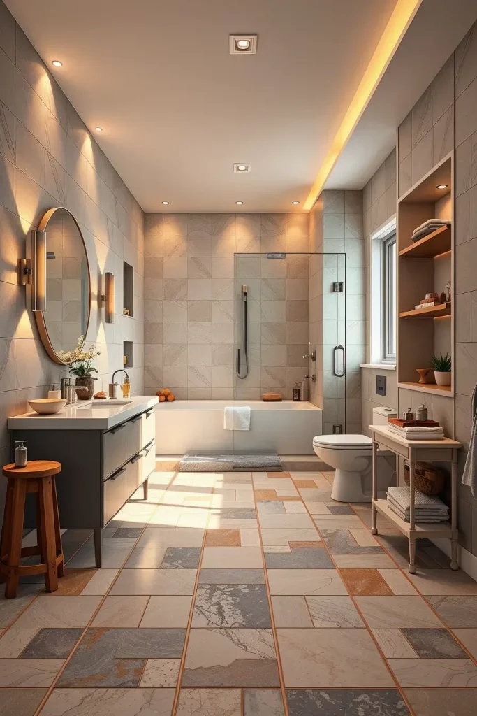 I would also provide further advice on the combination of lighting with flooring before filling out this section. Layered lighting in 2026 bathrooms adds a lot of finishes to tile finishes, and I will always recommend the use of recessed LEDs and mounted sconces on the wall to accentuate the texture or finish on the tile.
