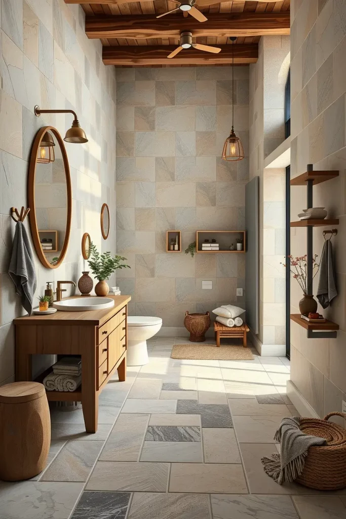 In order to match with natural stone flooring, I tend to choose such sophisticated pieces of furniture as warm wood vanities, brushed brass fixtures, and large-format mirrors. These components are added to the organicness of the stone and thereby increase its natural beauty. The luxurious effect is also provided by freestanding tubs, soft materials, and low key lighting.