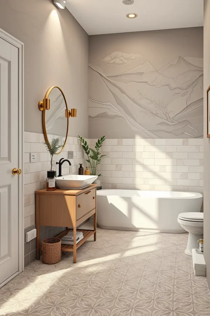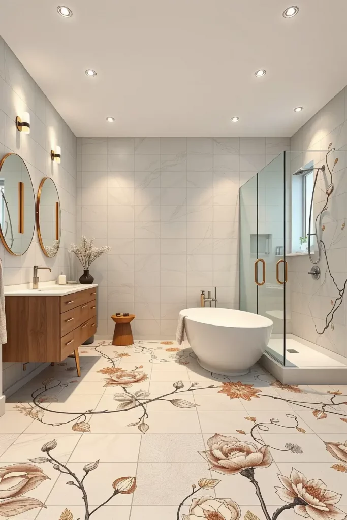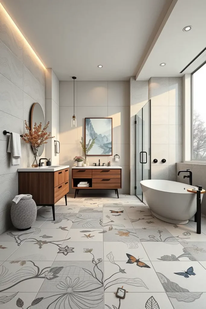 Personalized tile art is emerging as one of the most interesting directions of bathroom floor tile ideas 2026 as it provides a homeowner with a chance to turn a practical flooring into a unique piece of art work. In my design of bathrooms where I use custom tile art, I aim at how imagery, geometry, or illustrations of ornaments relate to the overall visual flow in the room. In this way, floor patterns will not seem to be an independent decorative feature but a component of a harmonious interior. Custom tile floors would be best used in a contemporary bathroom where all elements are carefully selected.