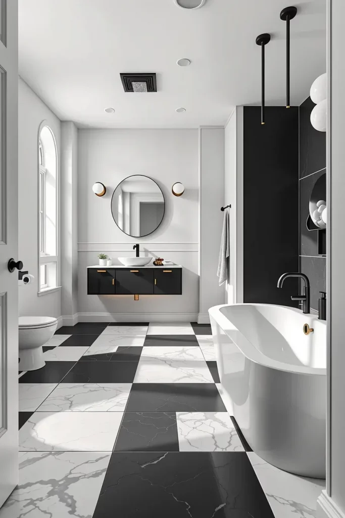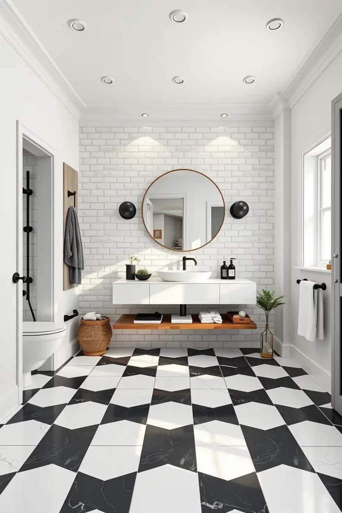 I normally use the checkerboard floor with a very plain vanity, sleek fixtures, and neutral walls in such interiors to make sure that the pattern does not swamp the interior. The floating vanity is used to give the room a visual lightness look, and the matte black faucets provide contrast and classiness. The use of lighting, whether it is globes sconces or smooth LED lamps, fits the geometric floor characteristics without attacking attention.