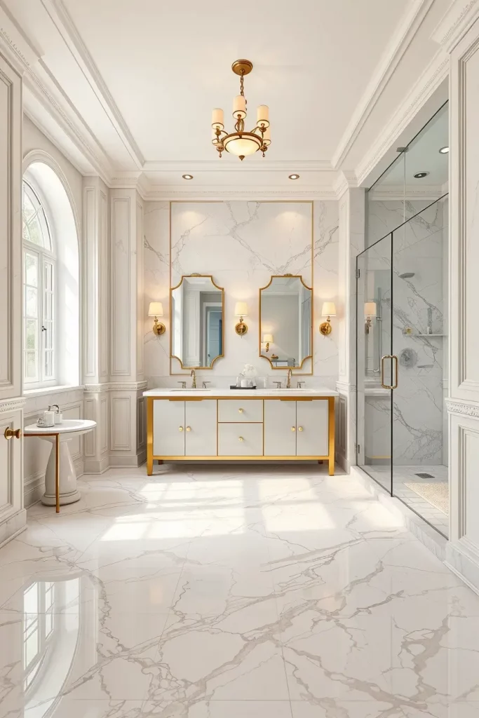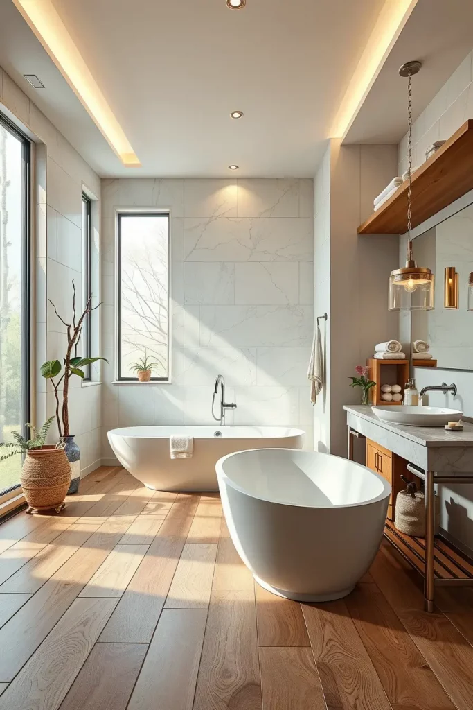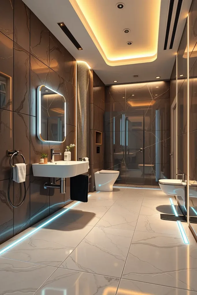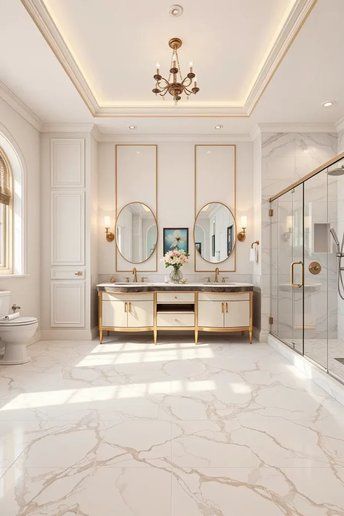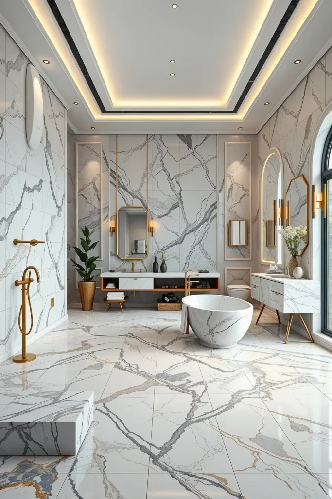 The floor is not the end in the luxurious spaces that I develop. Stone resin freestanding bathtubs, floating double vans, and brushed-gold fixtures along with ambient lighting in the form of LED lights contributes to the richness of the flooring. These factors enhance the visual experience and lead to the general sophistication of the space. The presence of big mirrors, minor metallic ornaments, and the choice of decorative items also adds the high-end appeal.