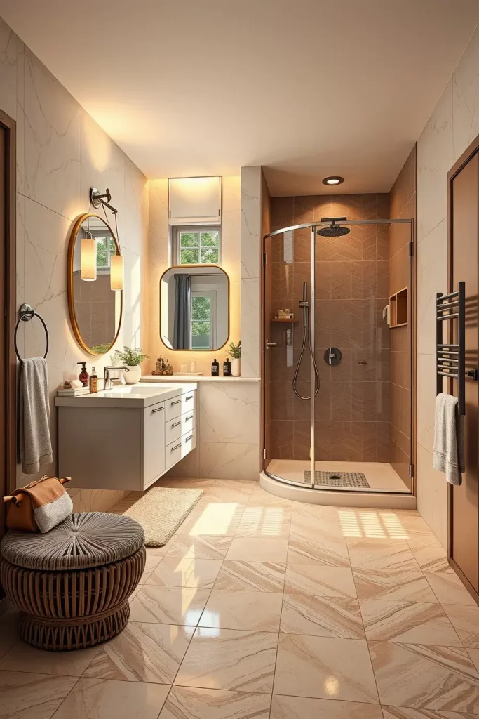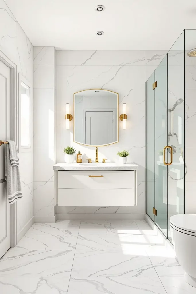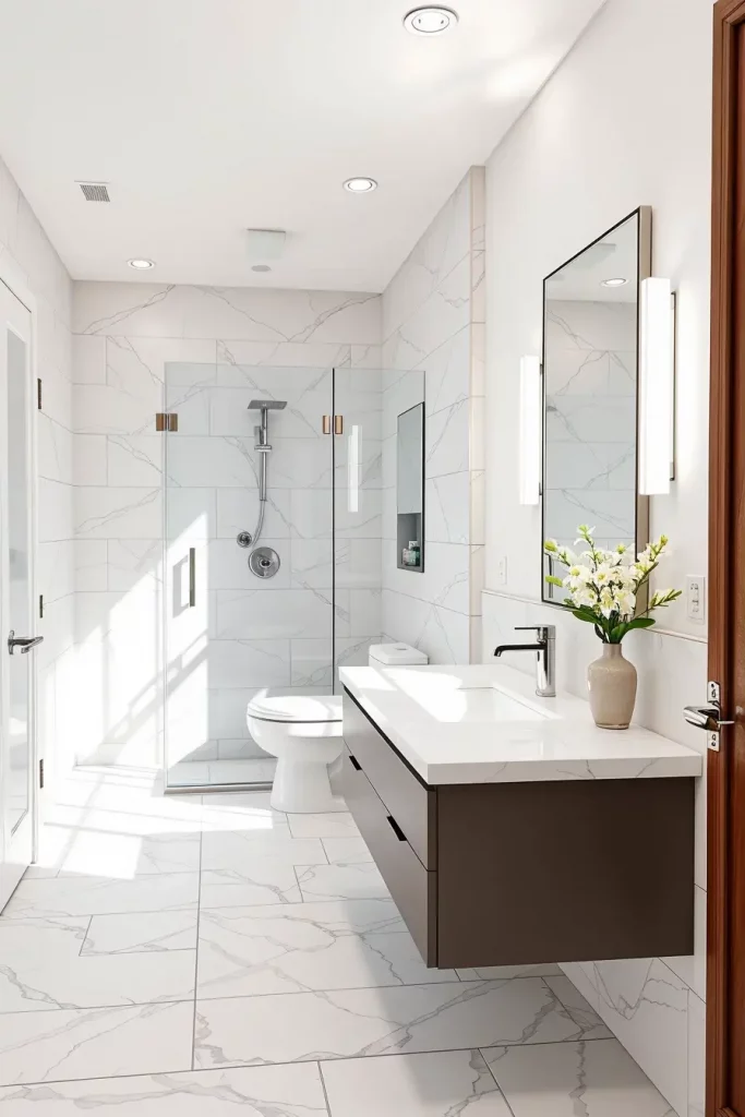 I would supplement these practical floors with furnishings and fixtures equally low-maintenance–floating vanities so that they can be easily cleaned under, frameless showers so that they accumulate little hardware, and quartz countertops that can withstand daily wear. All these make the bathrooms highly effective and yet modern and elegant.