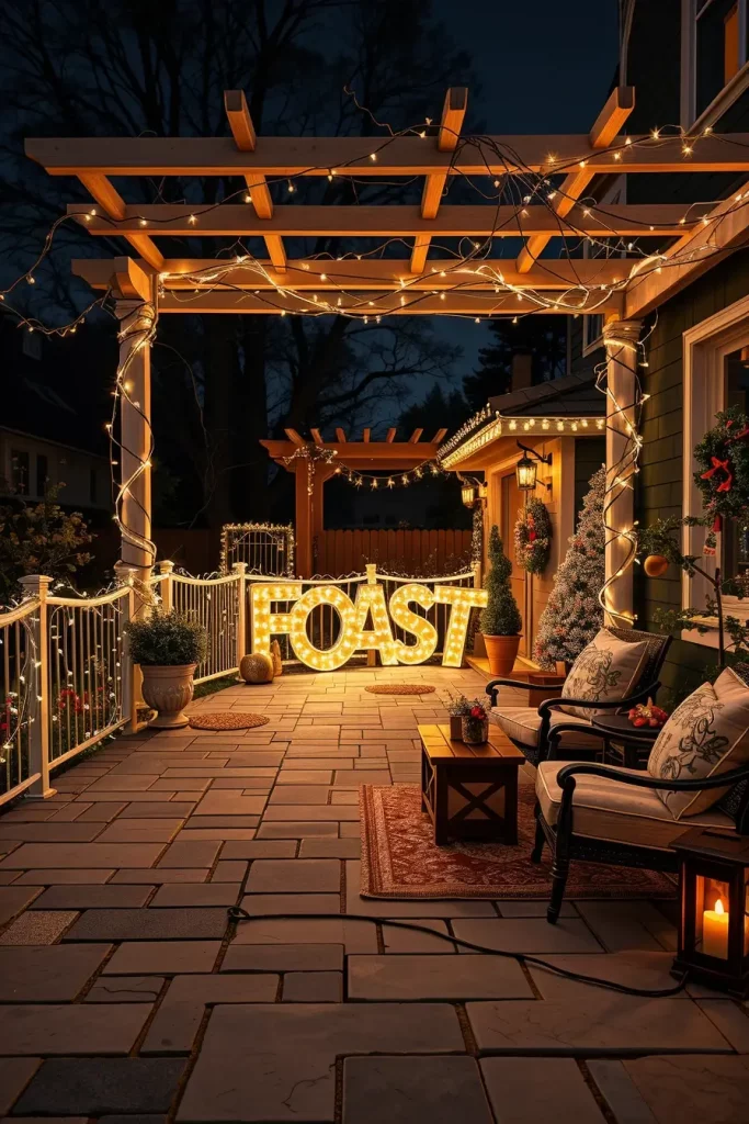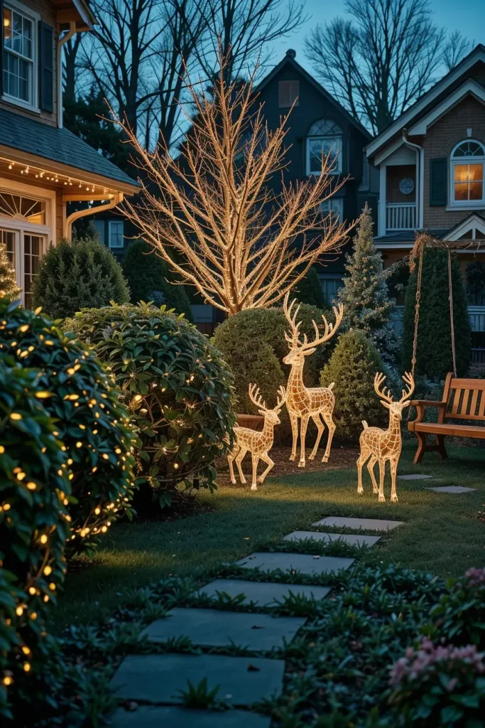 Every detail counts here. I usually use ground spotlights which are either green or red with overhead fairy lights to emphasize textures and layers. The yards can be turned into a set of a holiday movie by adding illuminated figures of reindeers, snowmen, or displays of gift boxes. In the case of furniture, even common benches may be covered with glittering lights in order to make people stay outside even longer.