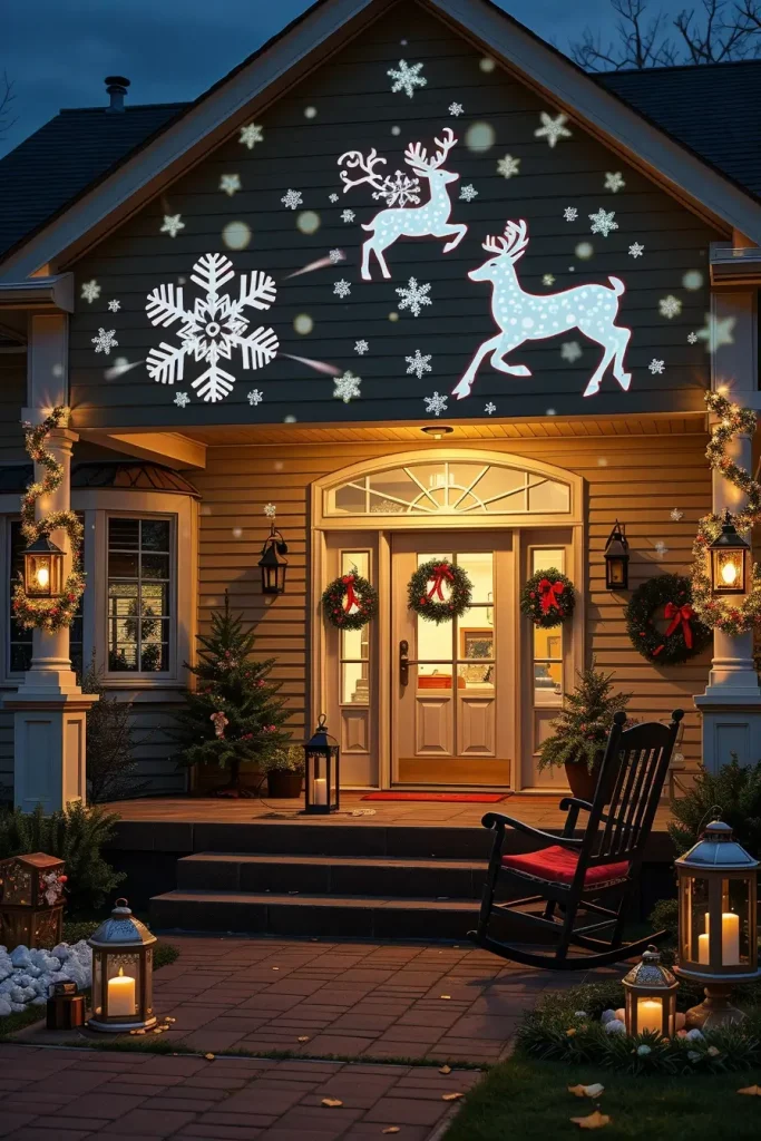 My projects have projector lights that are installed at the bottom of a garden or close to a driveway and the angle of the projector should be such that it encompasses the front face of the house. I combine them with simple decorations of the porch like lanterns, wreaths, and planters so that the animated projections are balanced. The seating outdoor such as rocking chairs on the porch is also more beautiful under the projection of patterns.