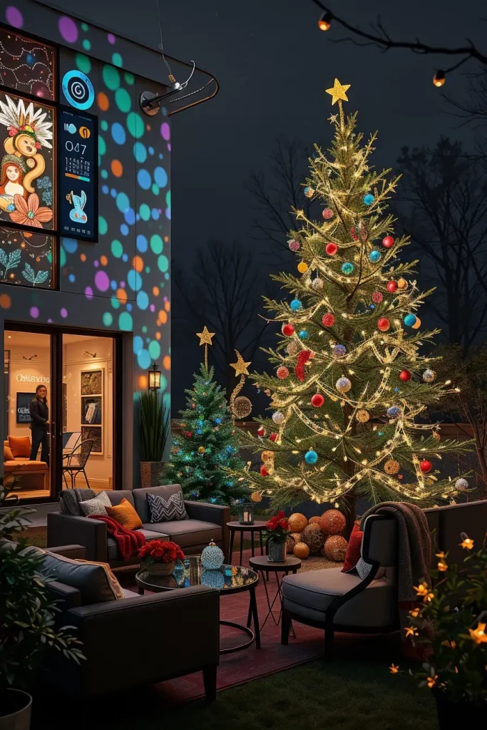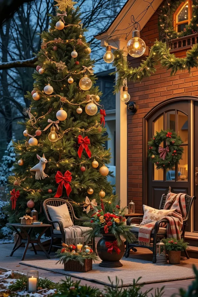 I combine a combination of the string lights and bigger C9 bulbs when decorating trees that are dramatic. A complete appearance is added with the use of shatterproof ornaments and ribbons and spotlights on the bottom emphasize the form of the tree. In case there is outdoor furniture nearby, I align cushion, and blankets to the color scheme of the tree.