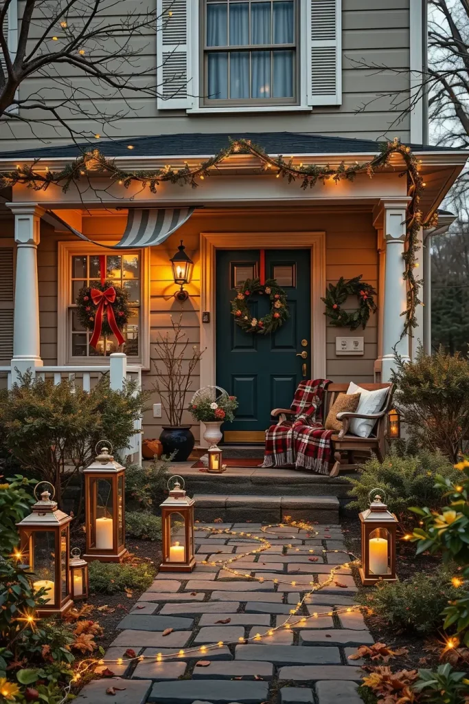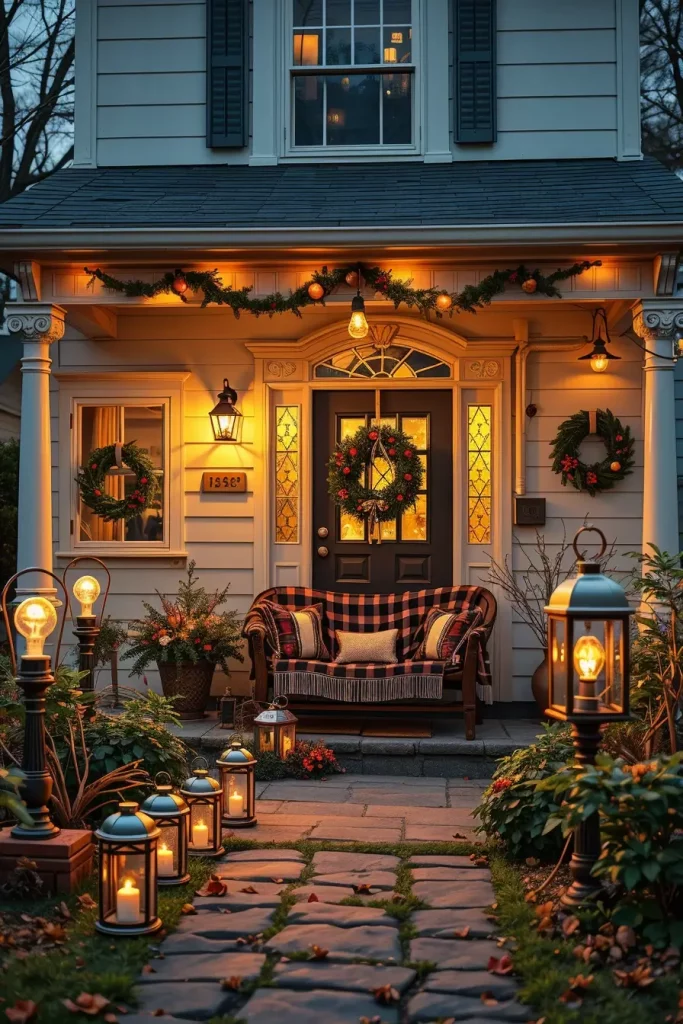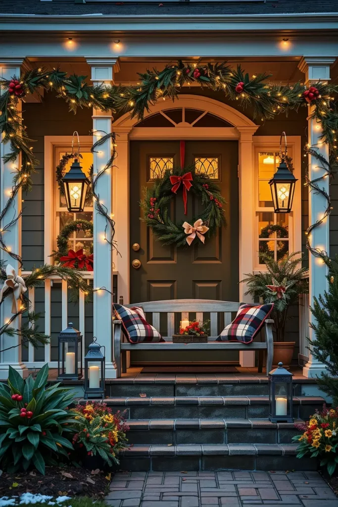 Practically, I will also cover railings of a porch with string lights, put illuminated garlands on a doorframe and lanterns on the steps. The look is held together by a wreath on the door which is lit. To further enhance the holiday spirit, there are outdoor benches and cushions of plaid or little potted evergreens on either side of the entrance.