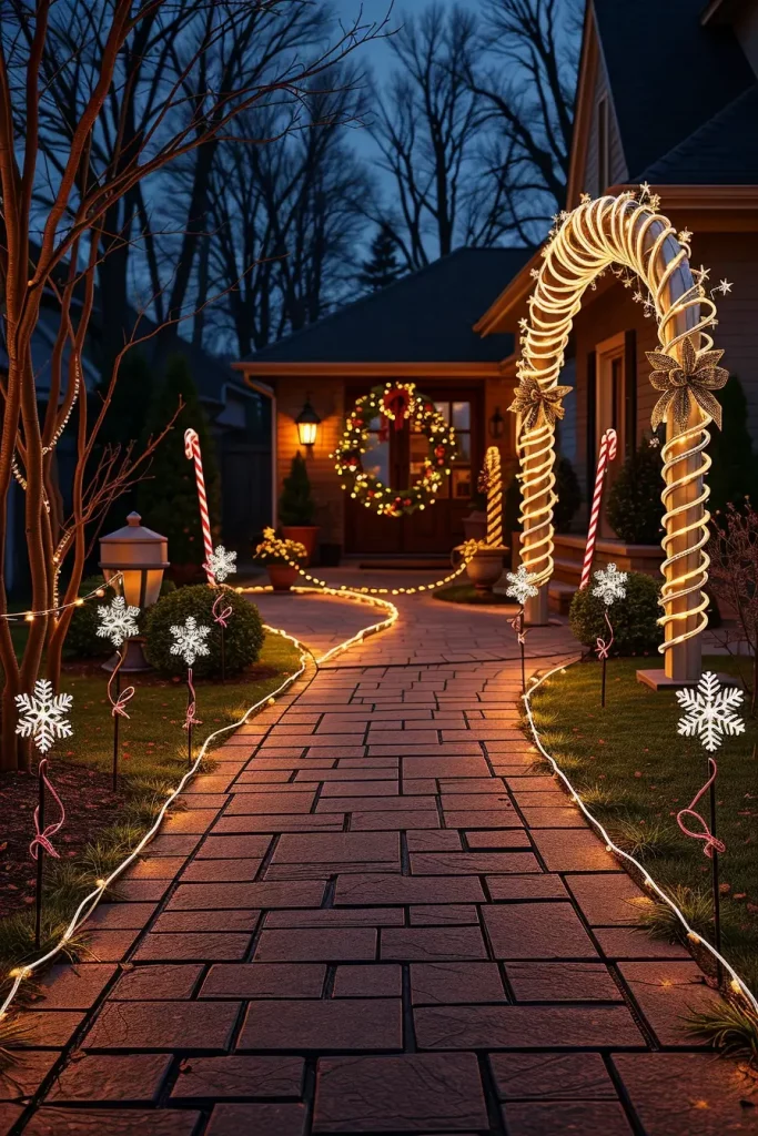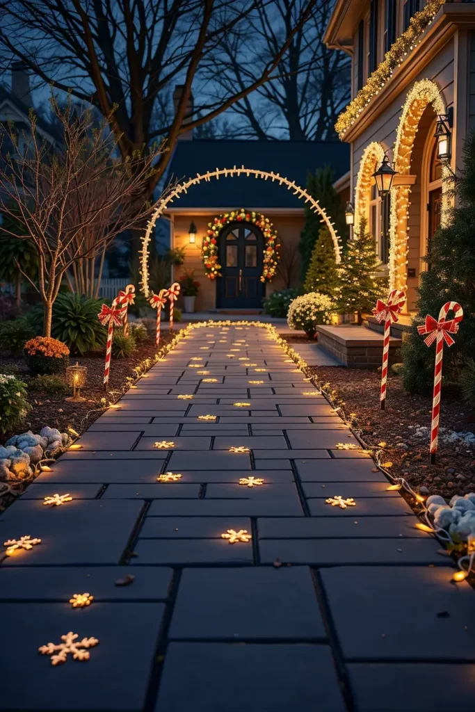 I tend to suggest a driveway that is bordered with rope lights or snowflake-shaped solar posts. Where there is a walk, I use candy cane posts or light arches which make a tunnel to the front door. Garlands on railings and fences on the surrounding ties the whole walk together into the general holiday motif.