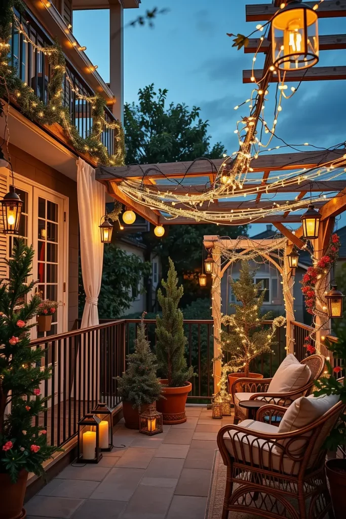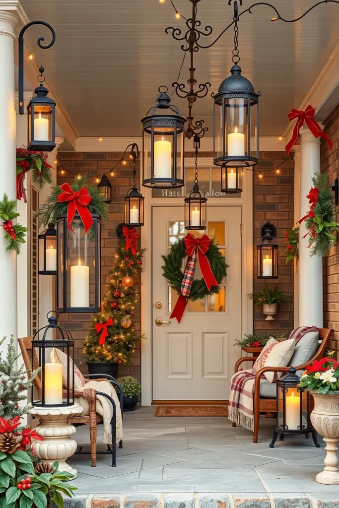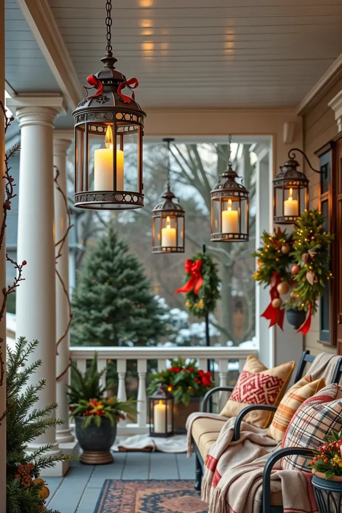 In terms of design, I will recommend that you combine both the old style lanterns made out of black iron and some that are ornamented with either frosted glass or cut out stars. By hanging them in varying heights, depth and movement are produced. When installed along with outdoor seats, lanterns create the impression of a small vacation lounge. The warm appearance is achieved by adding red or green throw pillows and blankets.