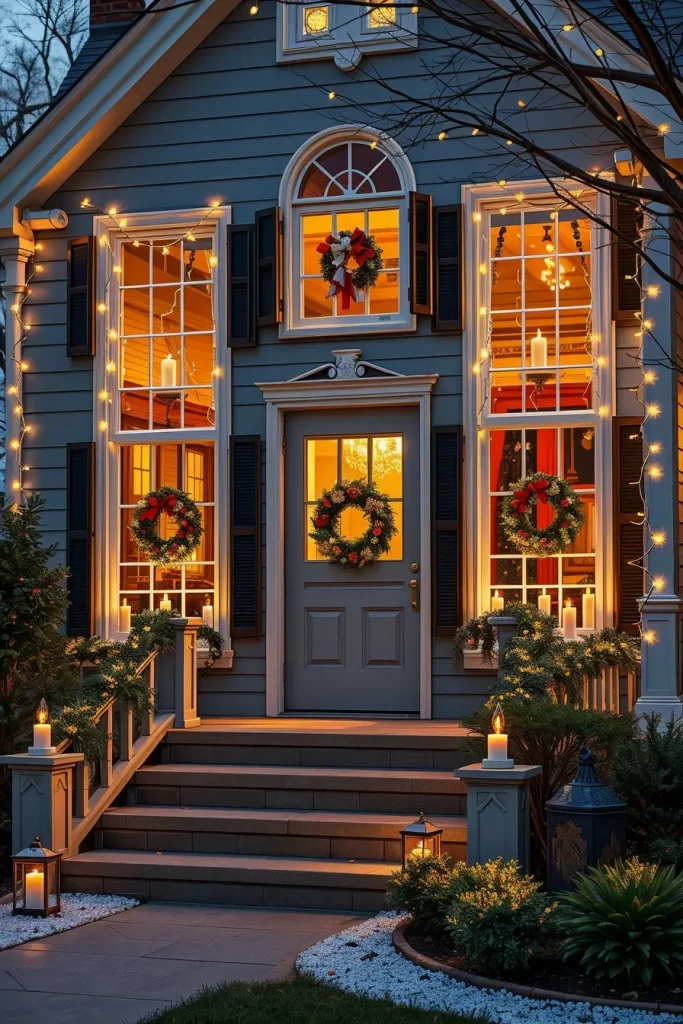 I tend to hang string lights around every window either in white or multicolor in accordance to the overall theme. Installation of candle-like LED lights over the window sills will make the interior and exterior look better. Bows or wreaths in front of the windows are also festive final touches.