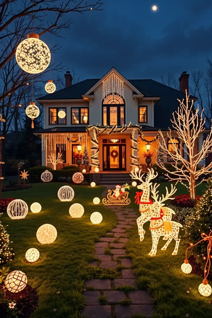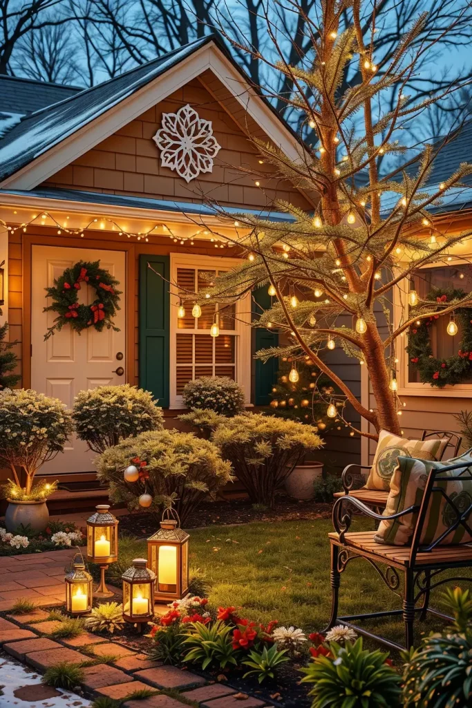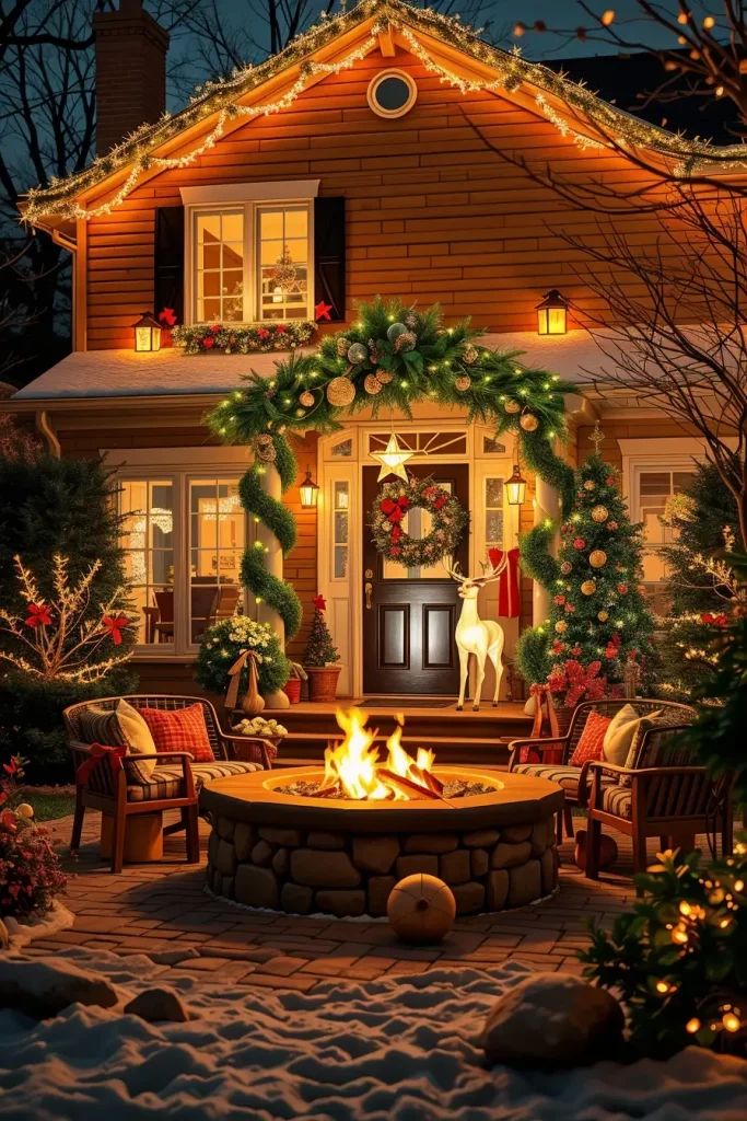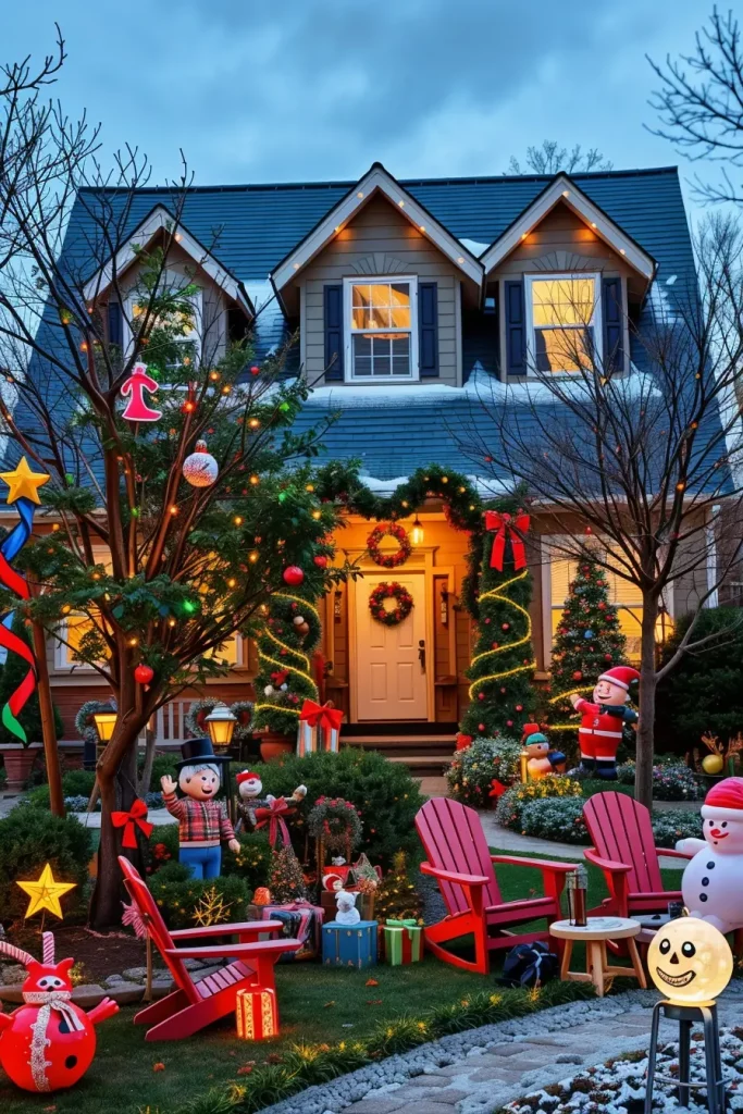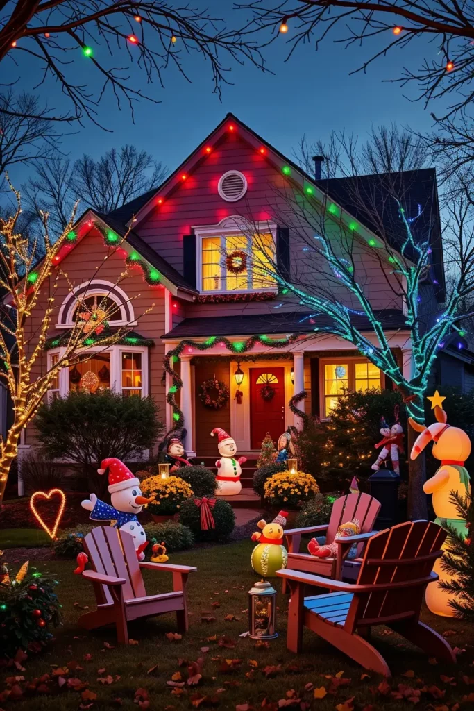 I would also include color by wrapping bushes with net lights, hanging multicolored bulbs along fences and hanging oversized ornaments that would reflect the light. Outside furnishings like Adirondack chairs which have been painted in vivid colors would go well in this arrangement as it would support the jubilant theme. I also observed that the combination of bright lights and inflatable reindeer or snowmen make the entire scene look alive and friendly.