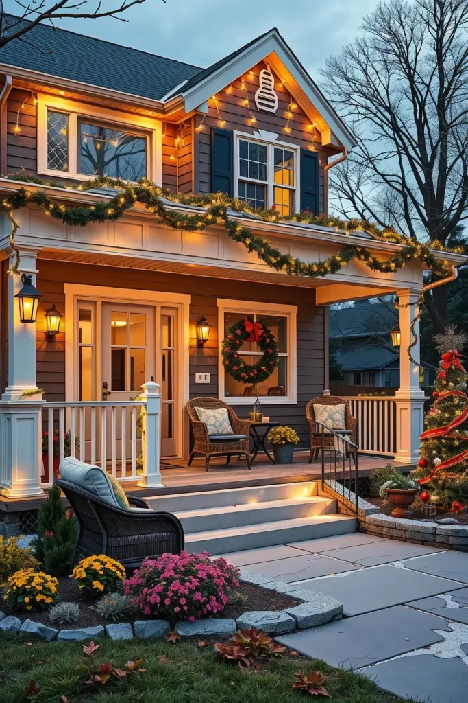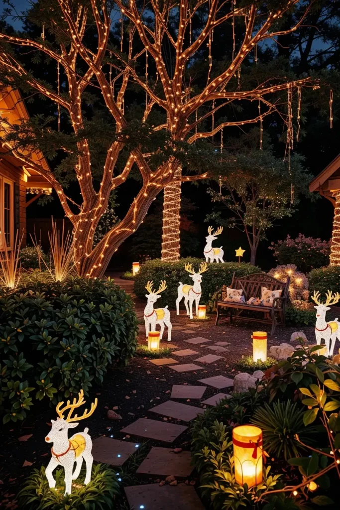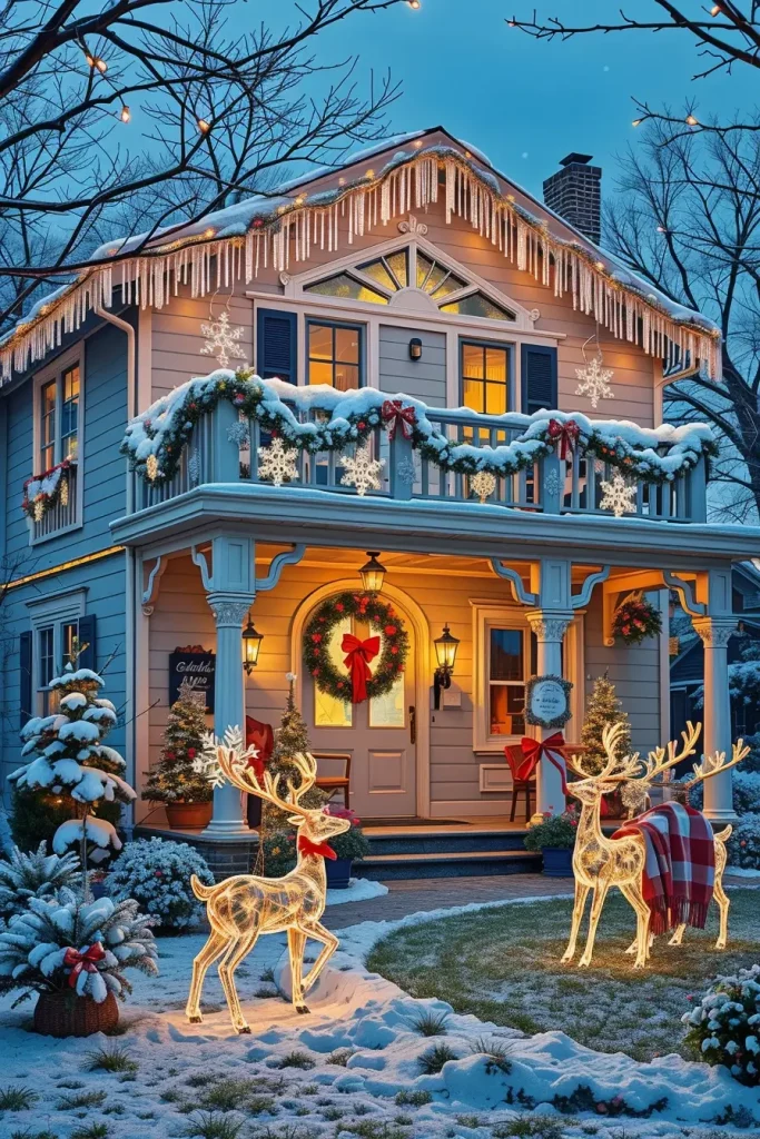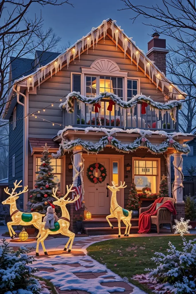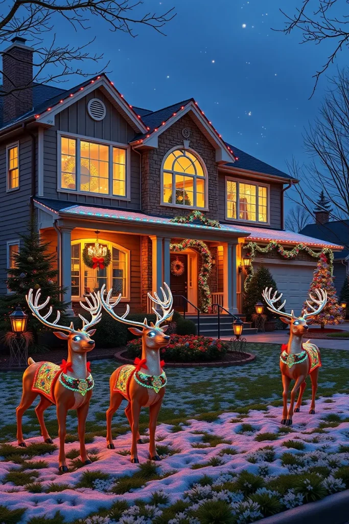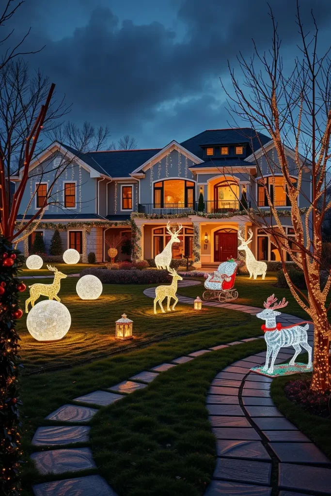 I would also include color by wrapping bushes with net lights, hanging multicolored bulbs along fences and hanging oversized ornaments that would reflect the light. Outside furnishings like Adirondack chairs which have been painted in vivid colors would go well in this arrangement as it would support the jubilant theme. I also observed that the combination of bright lights and inflatable reindeer or snowmen make the entire scene look alive and friendly.