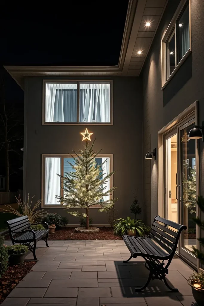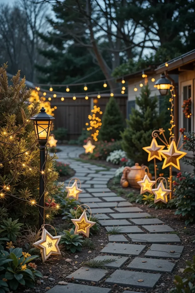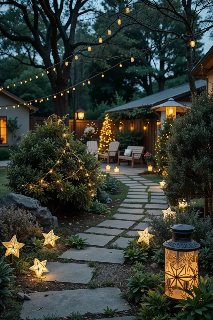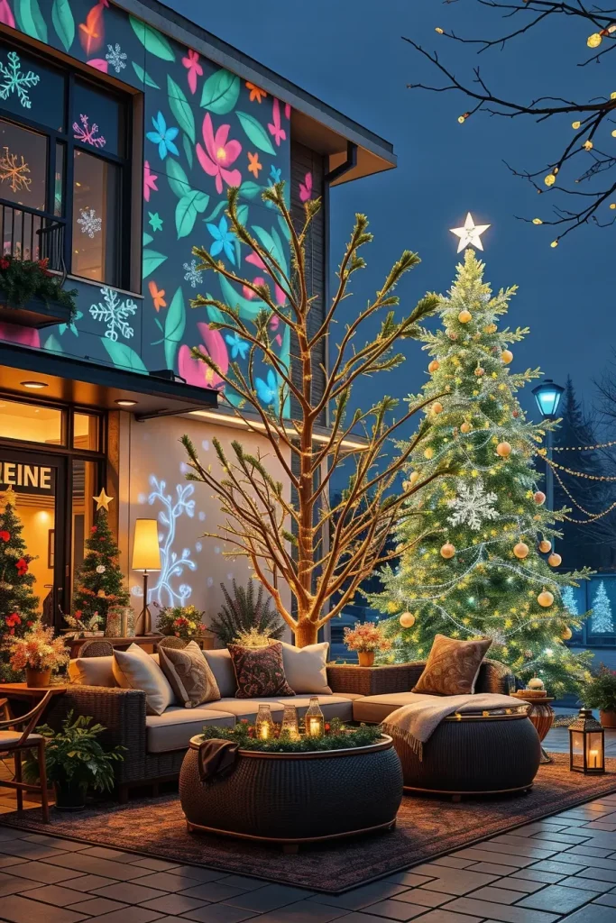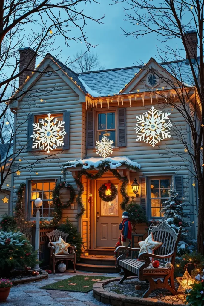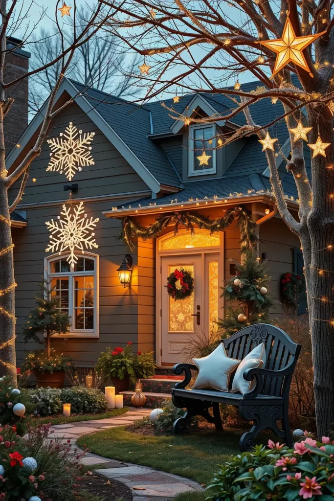 In projects I work on, I like combining sizes. Huge snowflakes on the wall of the house as well as tiny star motifs suspended on the branches all make a layered effect. The theme is improved by adding icicle lights or string lights that have the shape of stars. Small star pillows or blankets may be added to the lights to match the outdoor furniture such as garden benches or patio chairs.