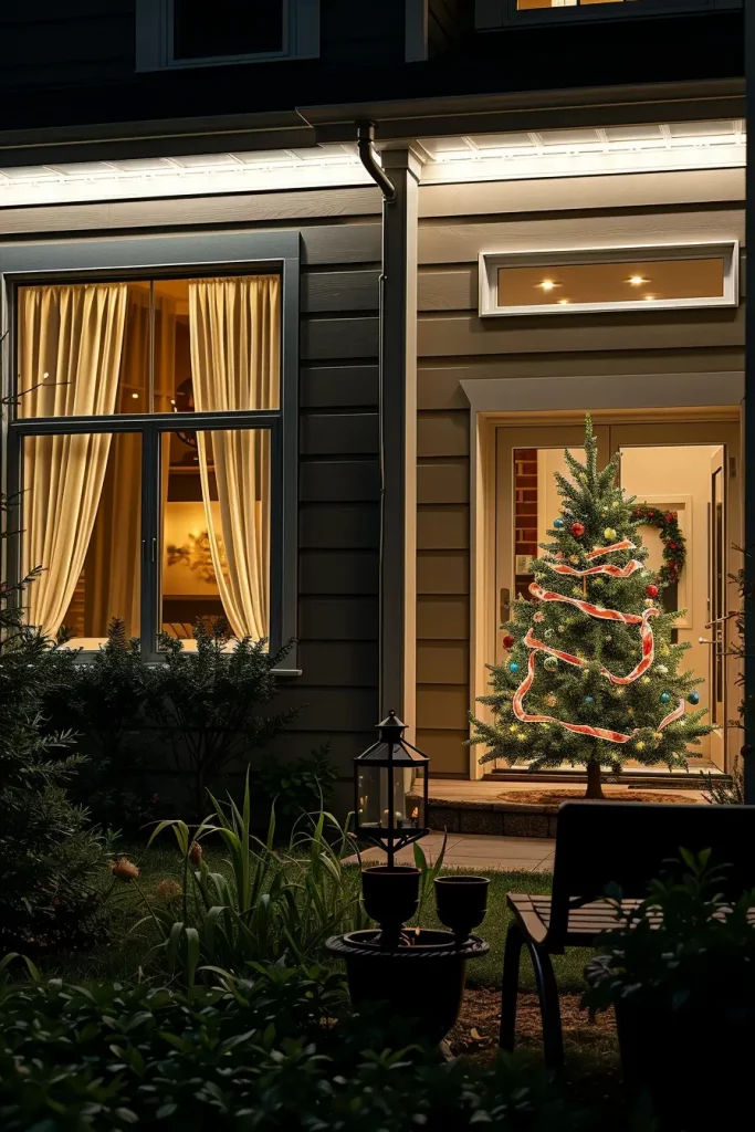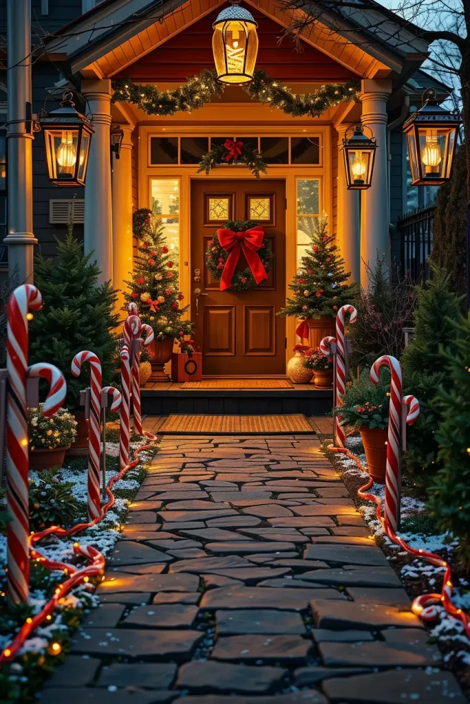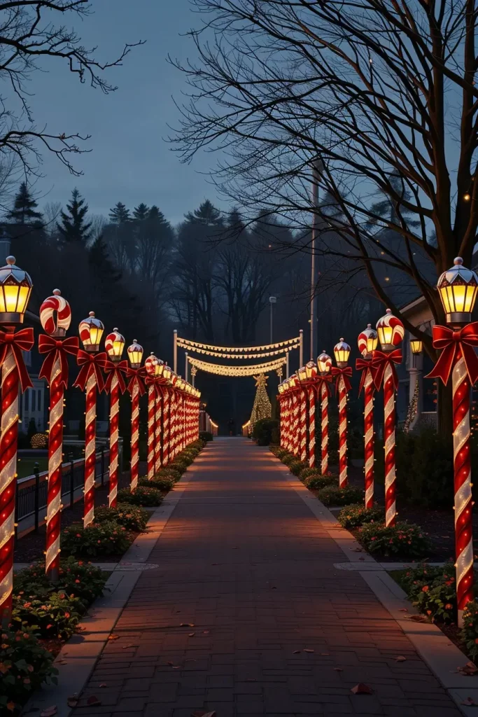 I also prefer candy cane poles in my design of the garden paths and driveways to be spaced evenly. To further decorate it, I occasionally attach small wreaths or bows on every pole. The combination of them with pathway lanterns or ground stakes makes the lighting layers that are inviting. In case you have outdoor seats or front porch, the look can be completed with similar candy cane string lights.