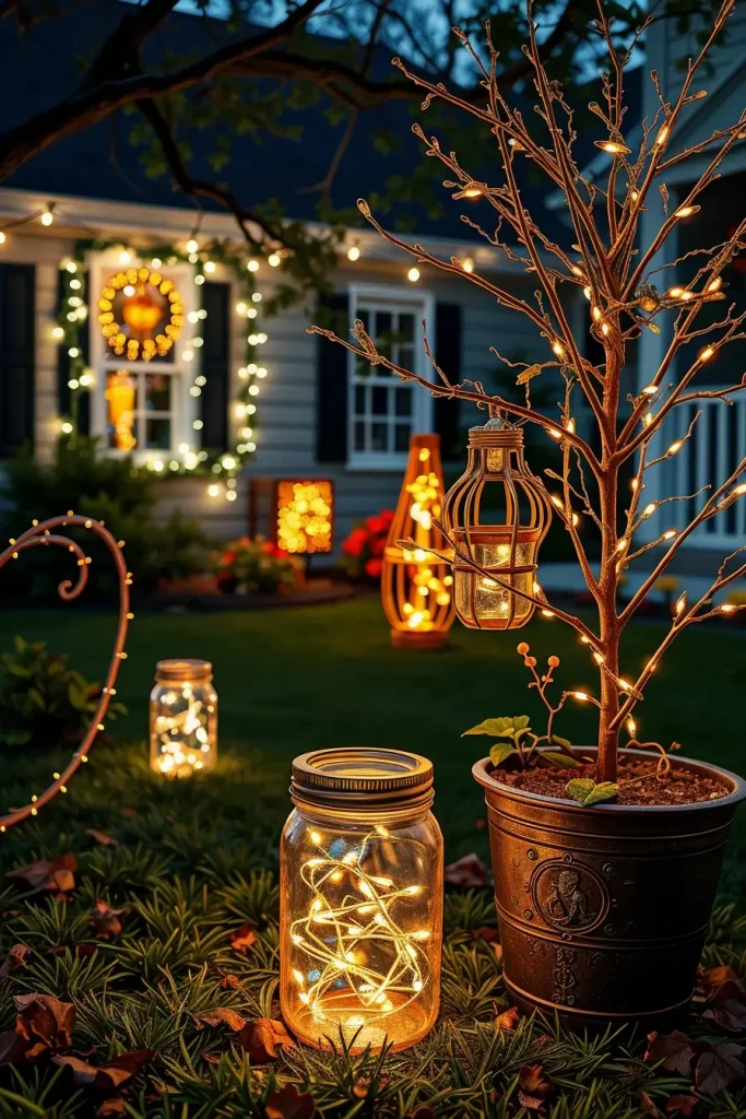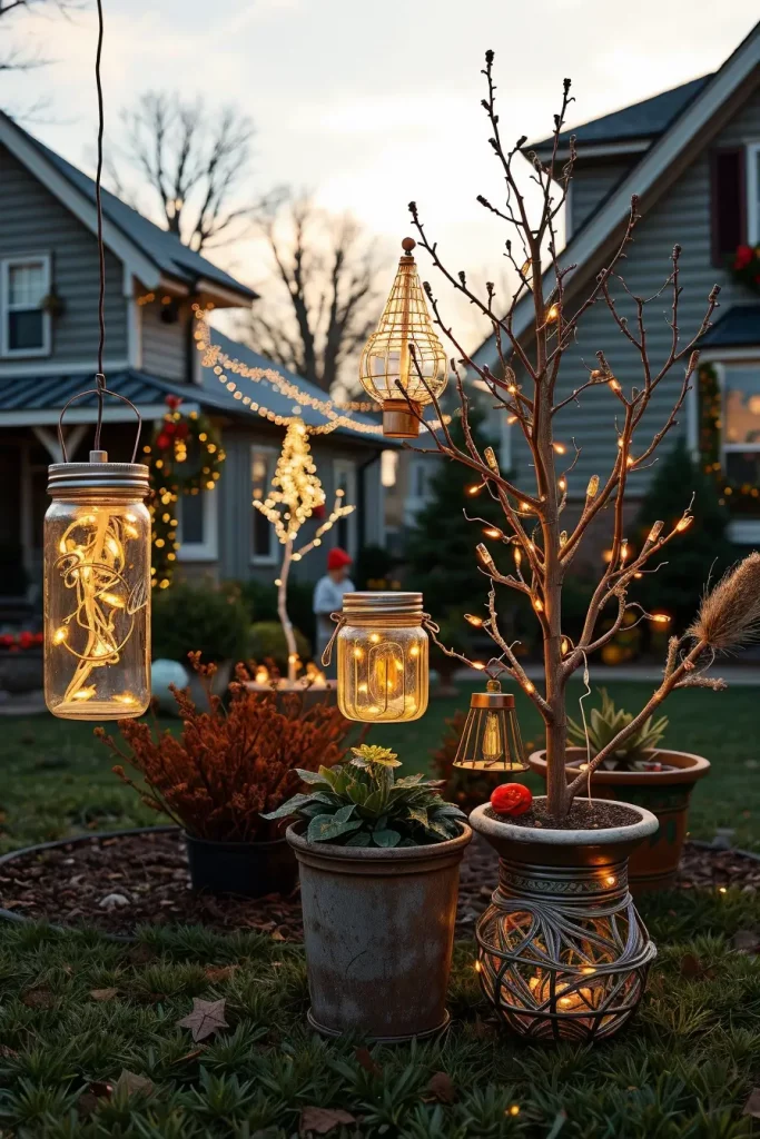 Wrapping tomato cage with strands of lights to make glowing cone-shaped trees in the yard, or filling the planters with the branches covered with LED strands, are some of my favorite DIY elements. In the case of porches, battery-operated lights in hanging jars give the effect of a handcrafted appearance. Wooden pallets that have holes cut out so as to resemble a star or a tree can be lit up as well to create a rustic DIY display.