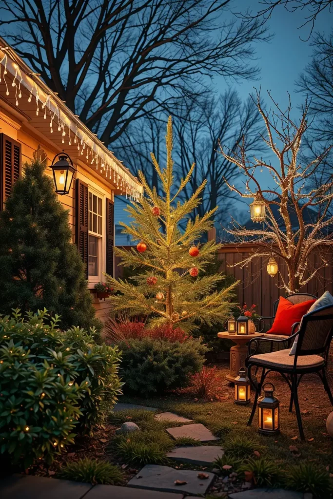 I prefer overhead string lights or rope lights on the pergolas on patios. It is no wonder to add illuminated planters, glowing lanterns, and comfortable outdoor furniture including rattan chairs with cushions. Balance is also achieved through small lighted trees or potted evergreens in a small space.