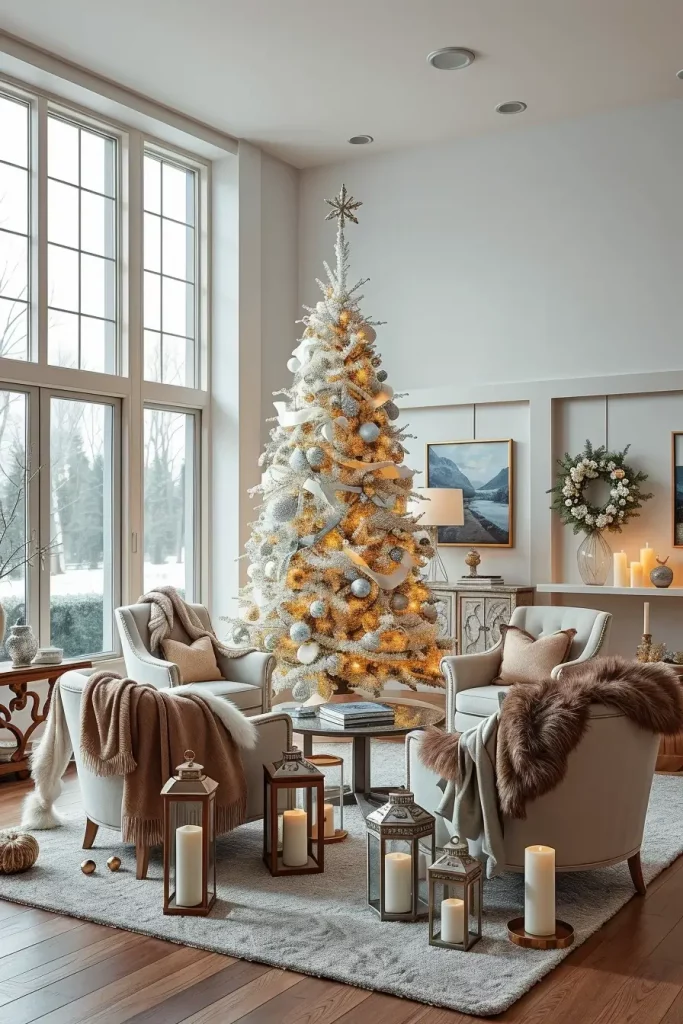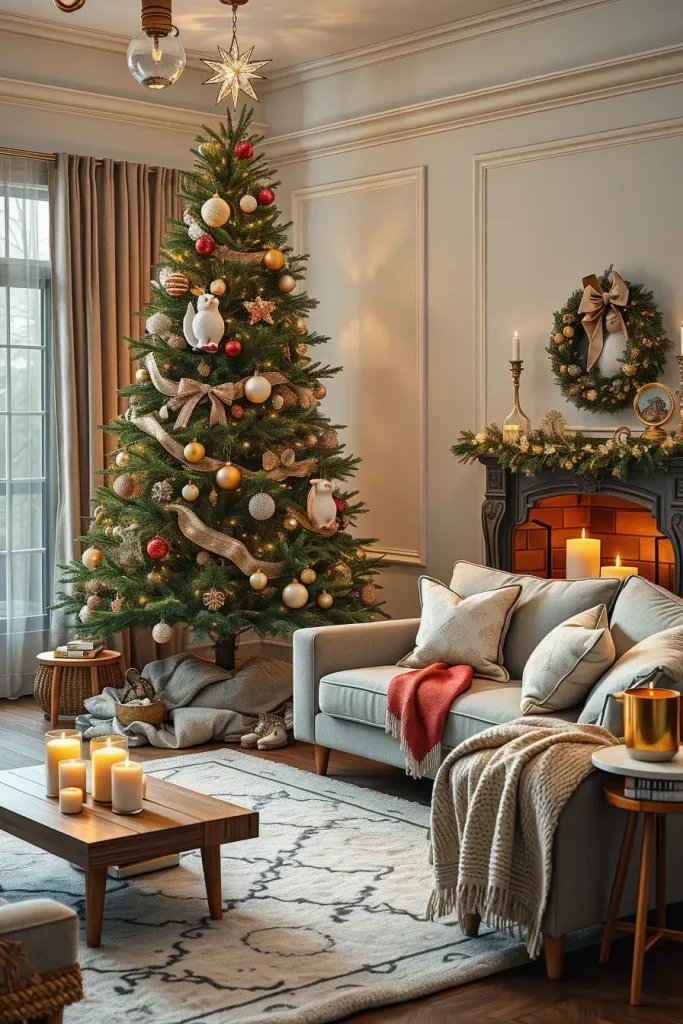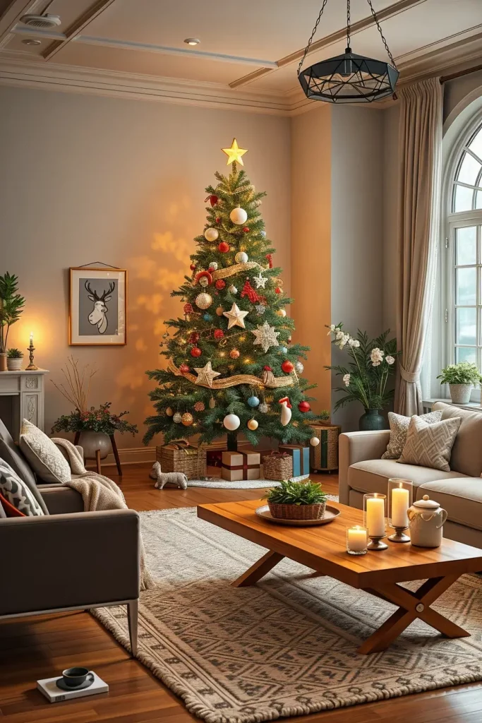 In this style, I prefer to work with soft LED fairy lights, neutral furniture, and a layered layout, which incorporates both garlands, baubles and ornamental branches. The tree is matched to the decor of the room such as metallic sounds and glass coffee tables or textured throws to sofas bring harmony. It can also be warmed up by a modern rug under the tree.