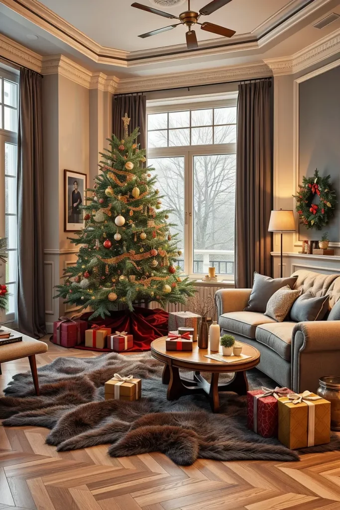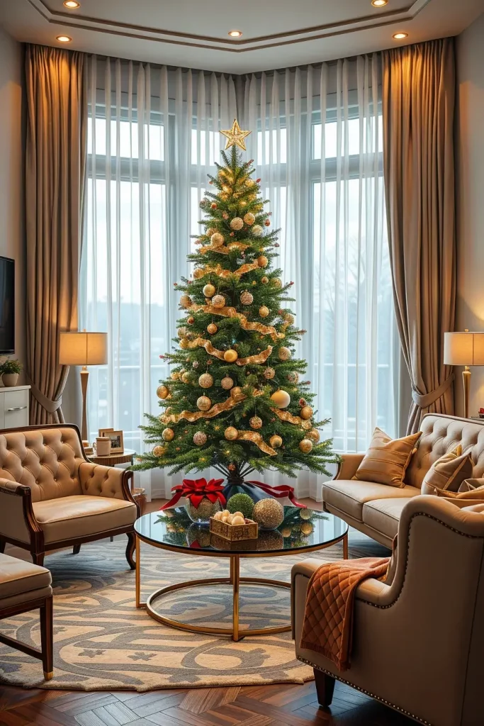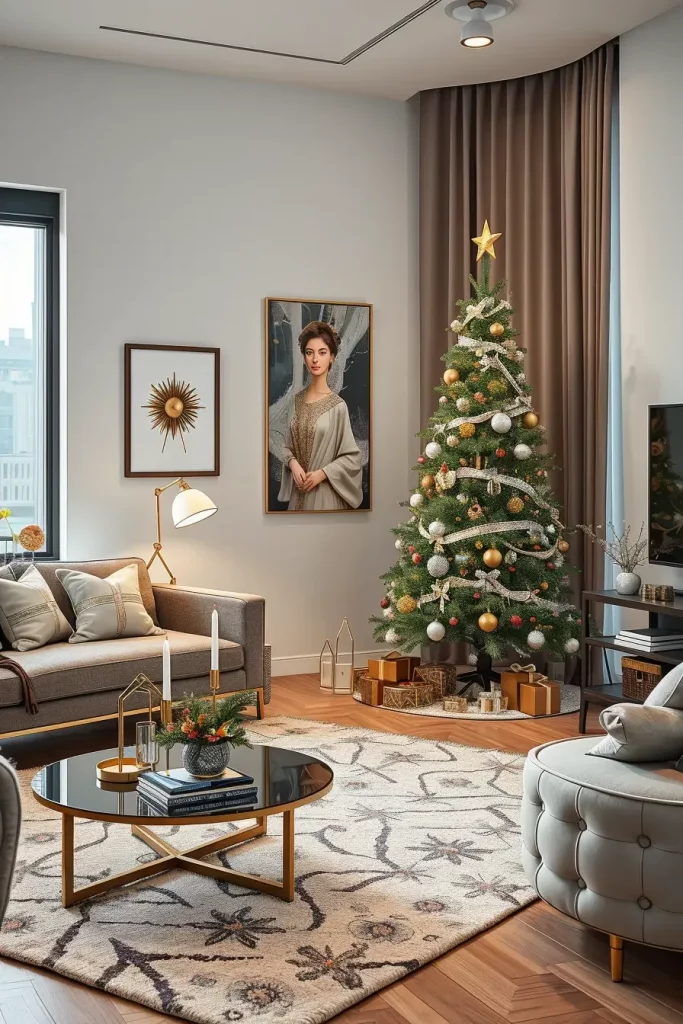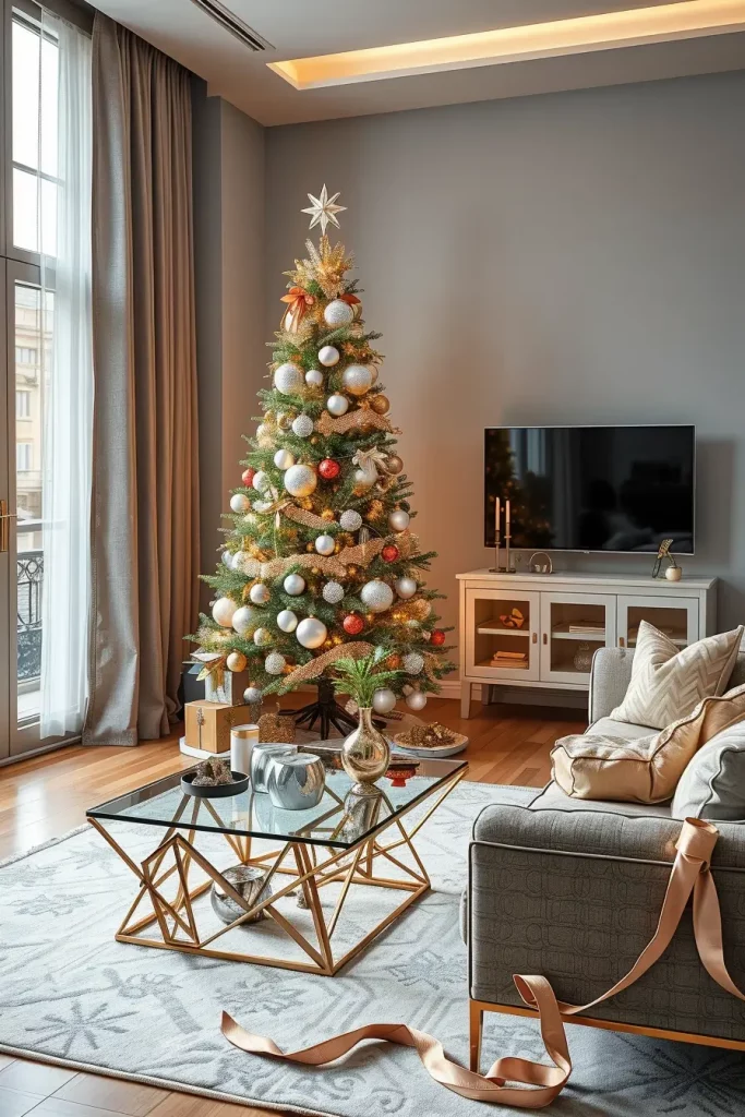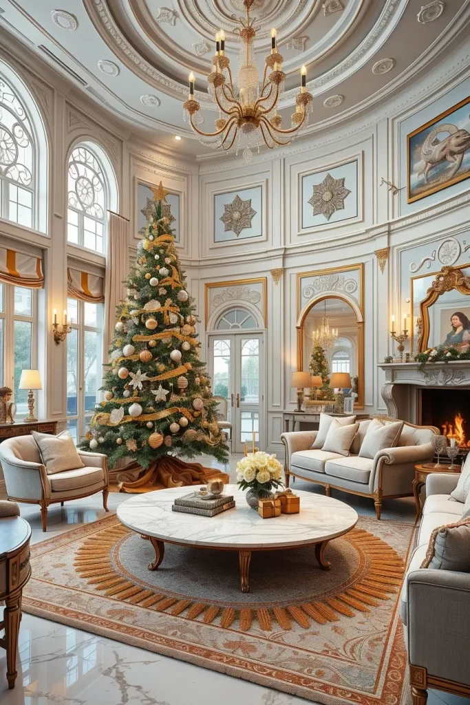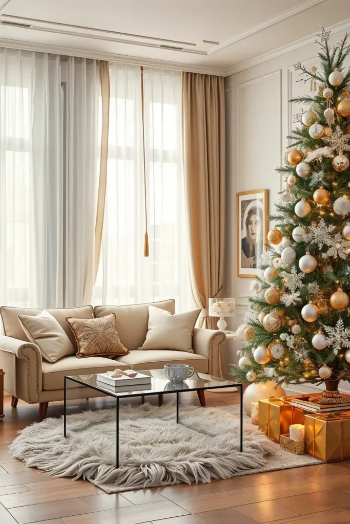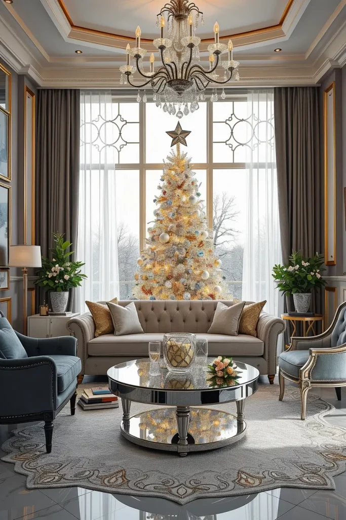 In my decoration, I use metallic decorations, glass accessories, velvet cushions, and fancy chandeliers. The bottom of the design consists of golden tree skirt and silver-wrapped presents, which makes the design cohesive. This appearance should be coupled with the support of soft furniture pieces such as ivory couches or marble coffee tables so that it appears luxurious without being too excessive.