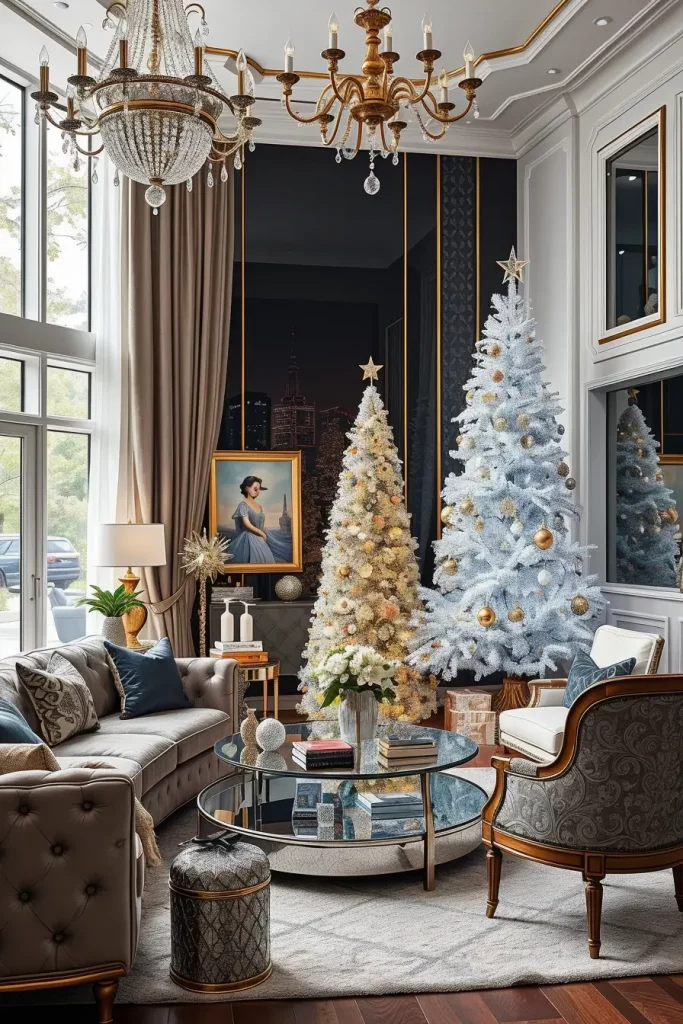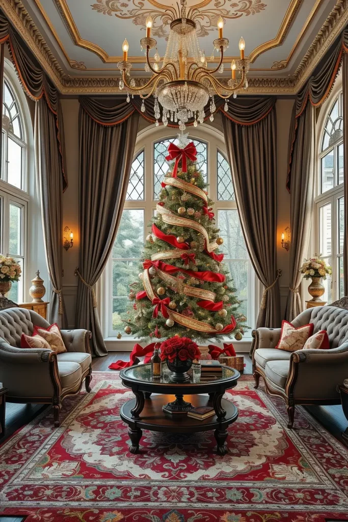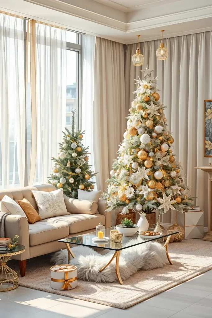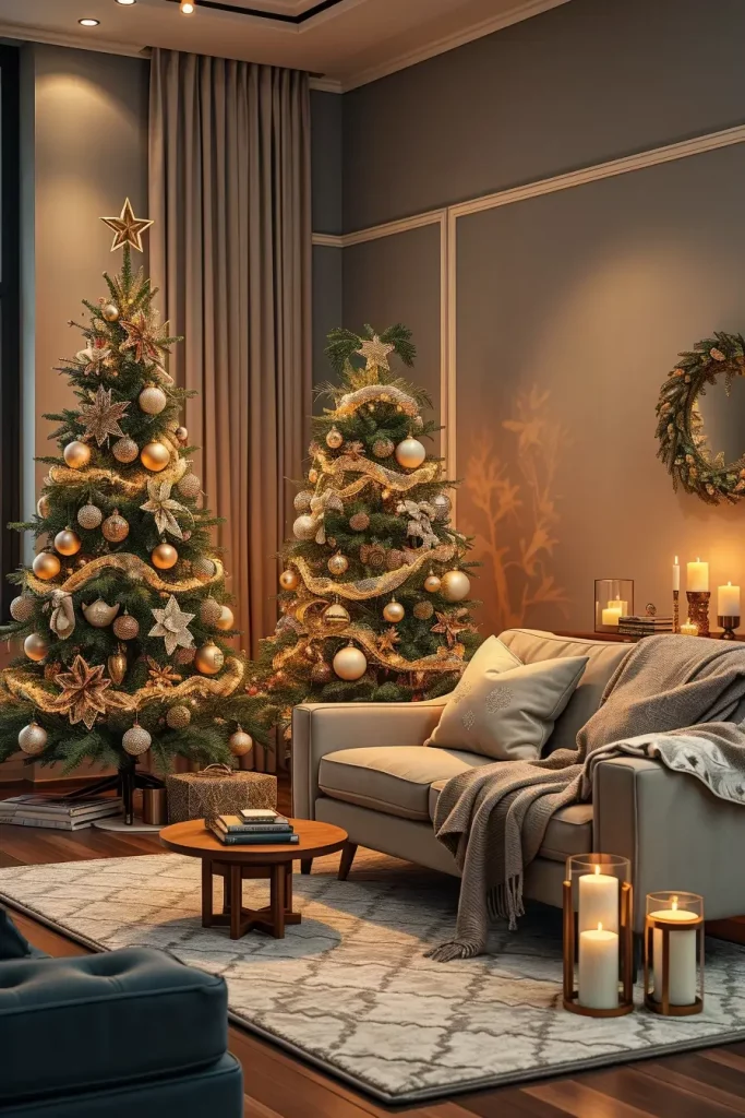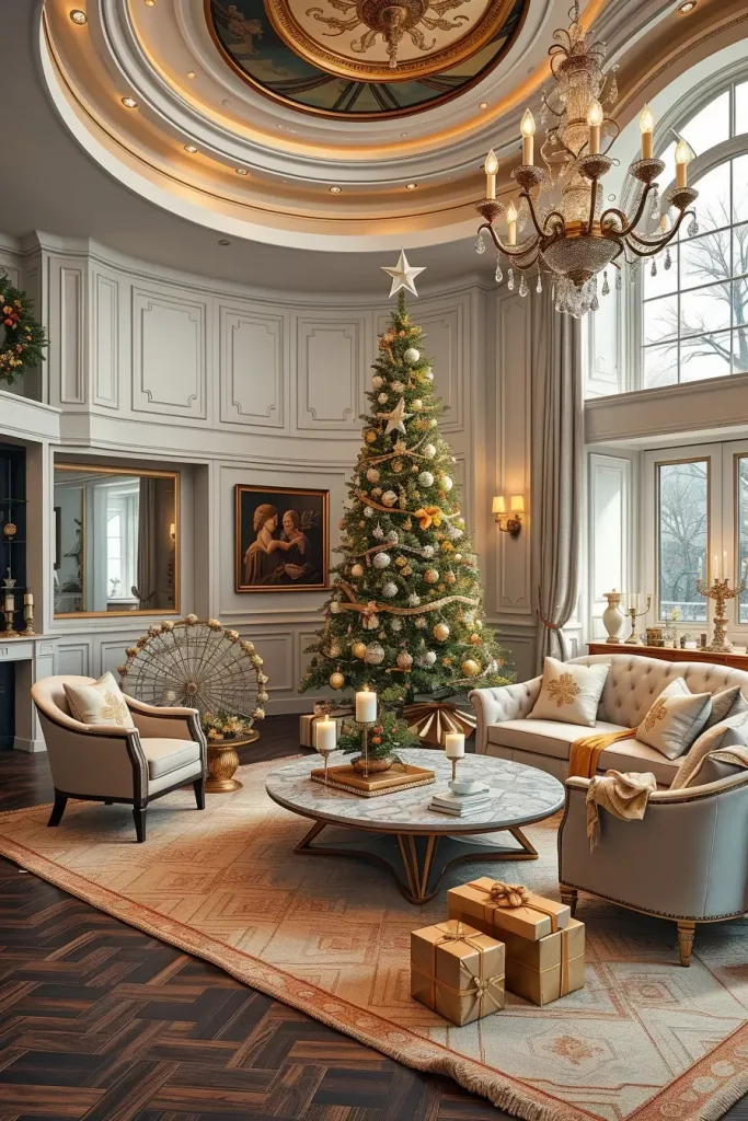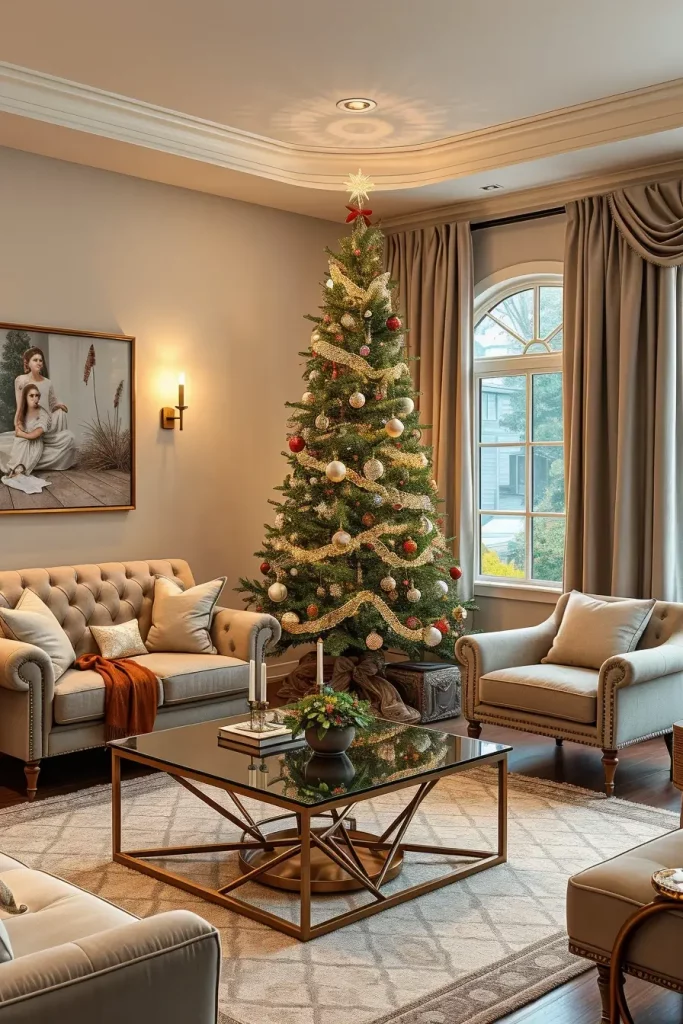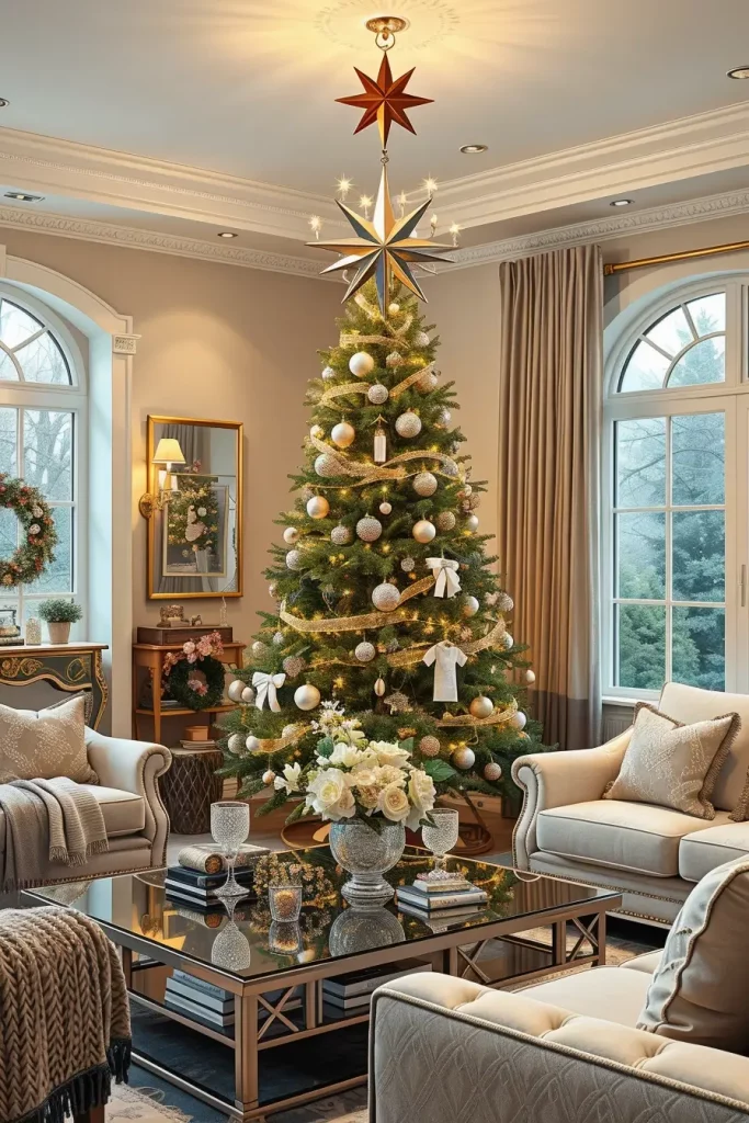In my decoration, I use metallic decorations, glass accessories, velvet cushions, and fancy chandeliers. The bottom of the design consists of golden tree skirt and silver-wrapped presents, which makes the design cohesive. This appearance should be coupled with the support of soft furniture pieces such as ivory couches or marble coffee tables so that it appears luxurious without being too excessive.