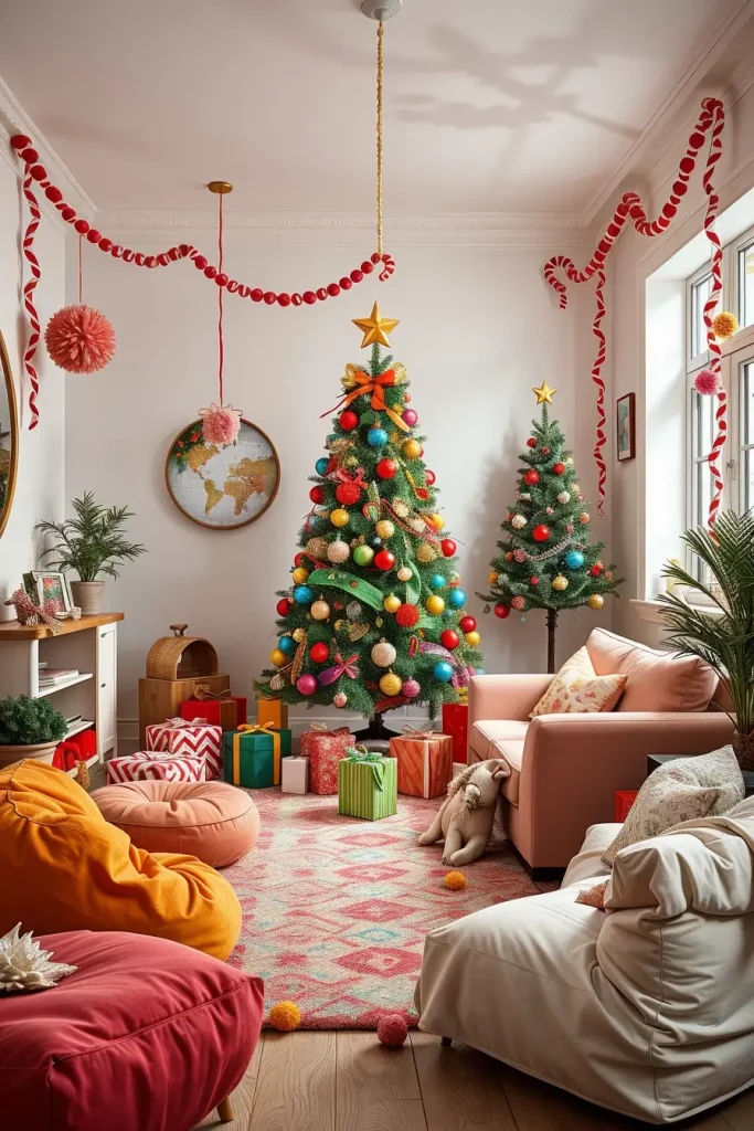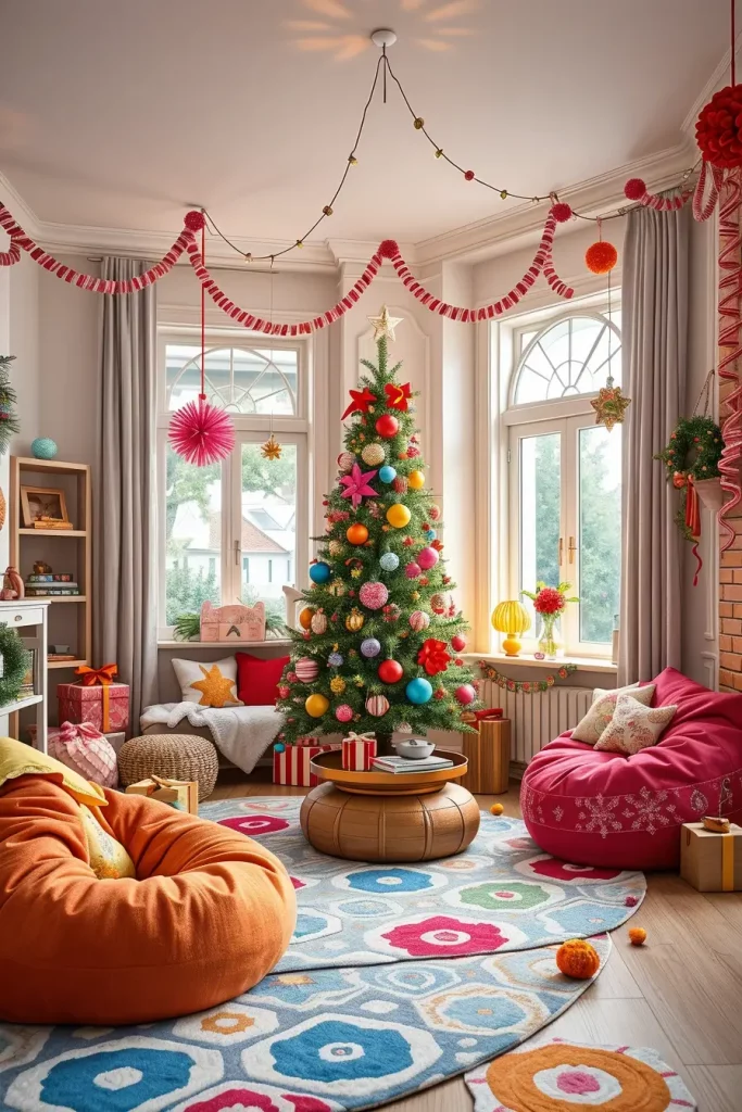 To create this appearance I resort to multi-colored ornaments, bright LED lamps, funny decorations such as stars, pom-poms and candy cane garlands. It can be enhanced by matching the tree with fun furniture such as beanbags or accent chairs of striking colors. The inclusion of patterned rugs completes the whole.