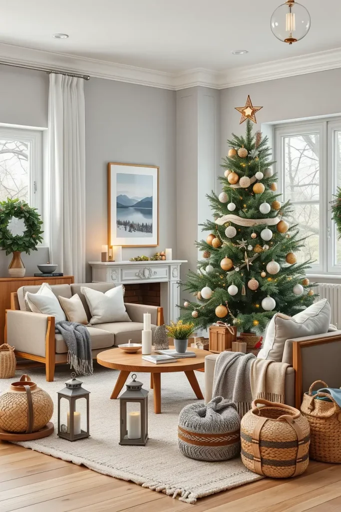 I keep the ornaments of a Scandinavian tree simple; that is, wooden stars, white baubles, and natural garlands. The tree is combined with wooden furniture, warm wool throws, and gray carpets, which adds to the look. The focus is constantly on harmony and coziness.