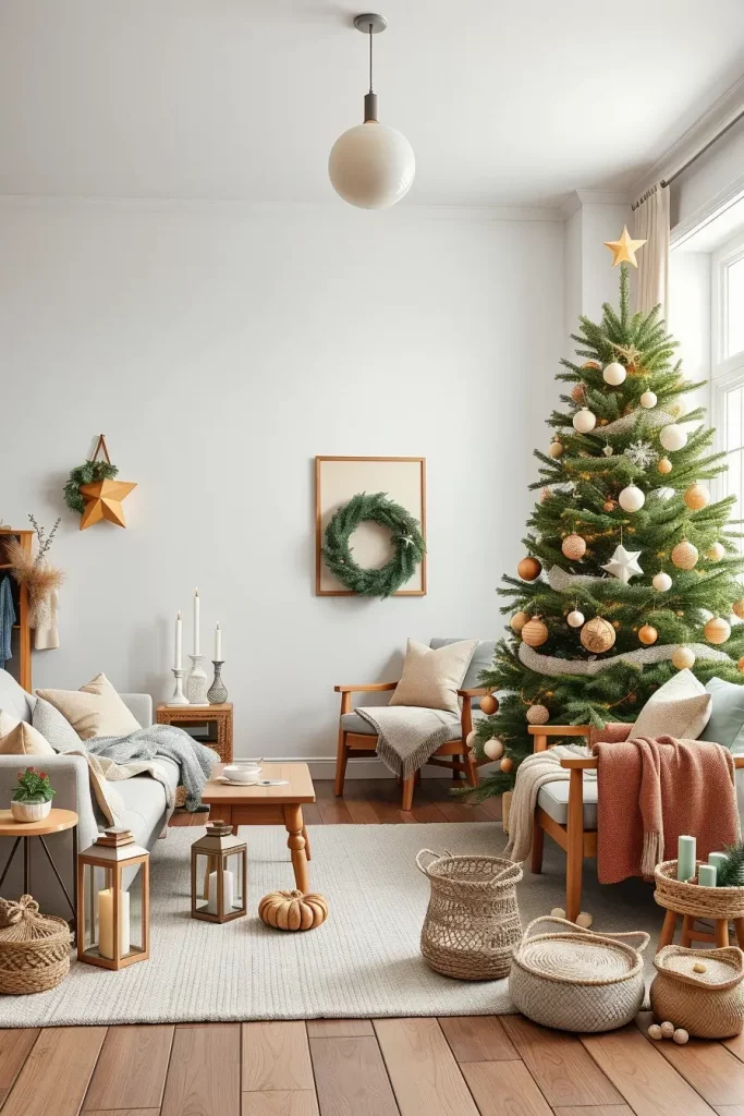 I would also suggest a few lanterns, a patterned rug below the tree, and plain woven baskets to store presents so as to finish the space.