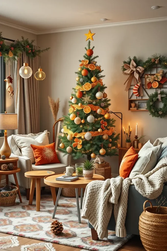 In my designs using DIY materials, I prefer using handmade ornaments in the form of paper, mason jar lids that I use as baubles, and dried slices of orange that I use as garlands. The rustic side tables and warm knitted blankets would help augment the homemade feel of the tree and the furniture. The room can be bound even by a simple pine wreath in the vicinity.