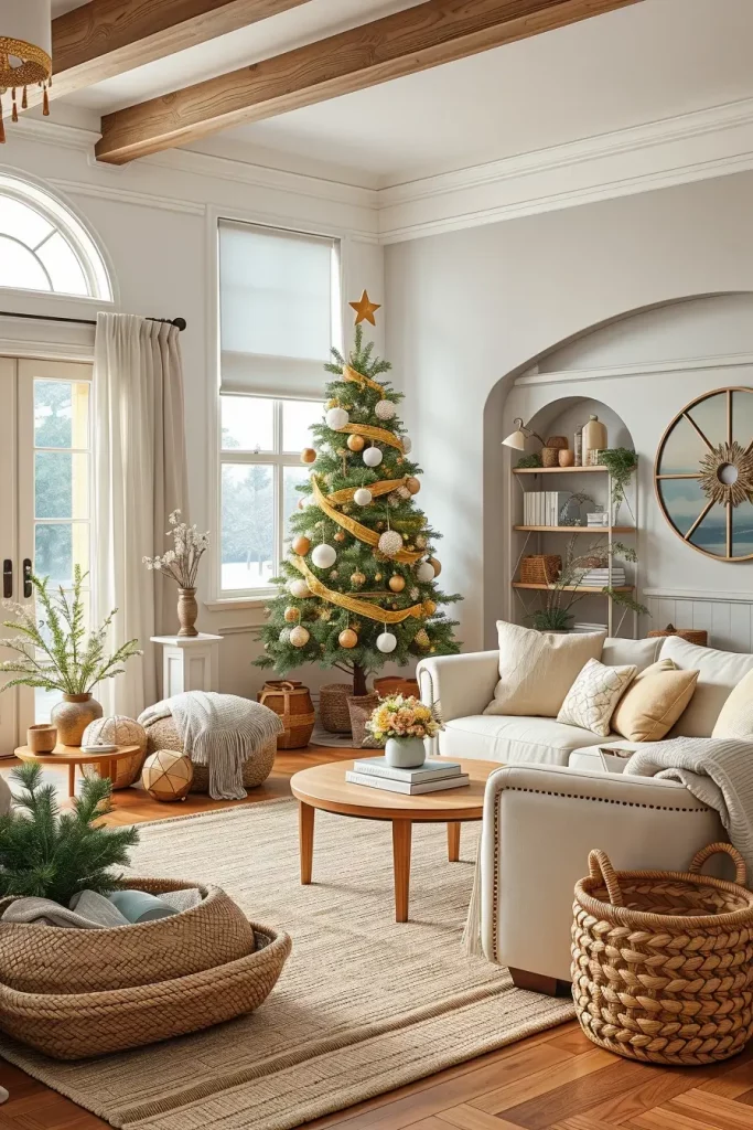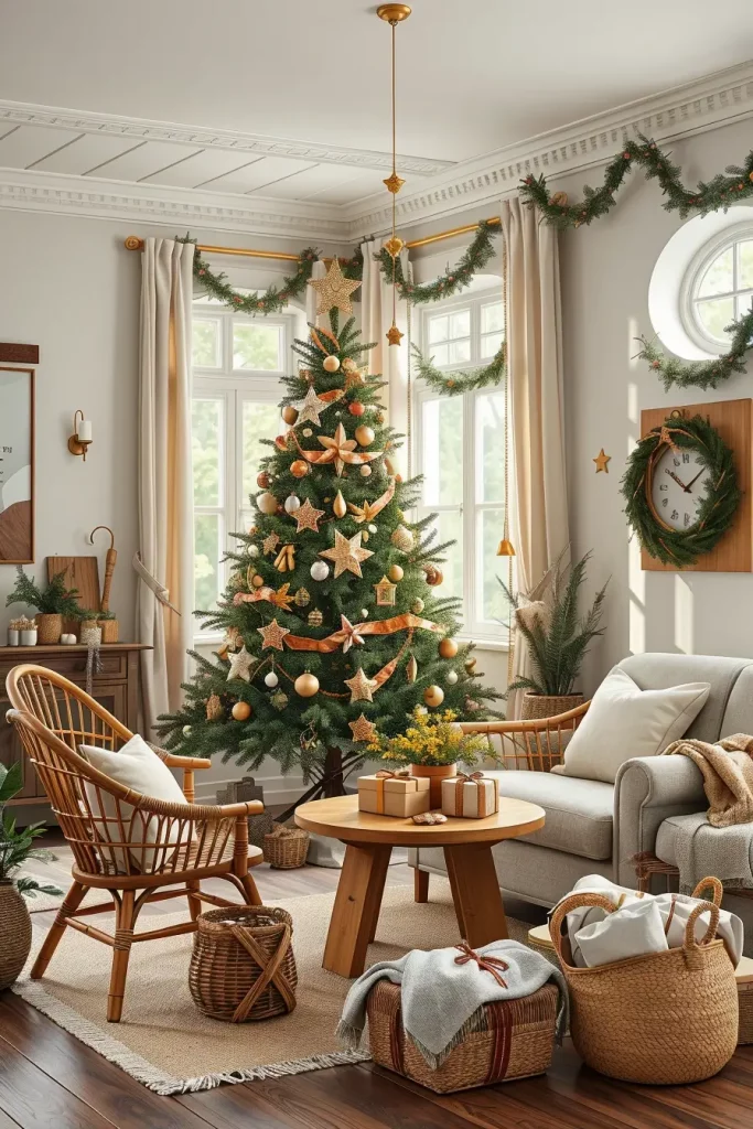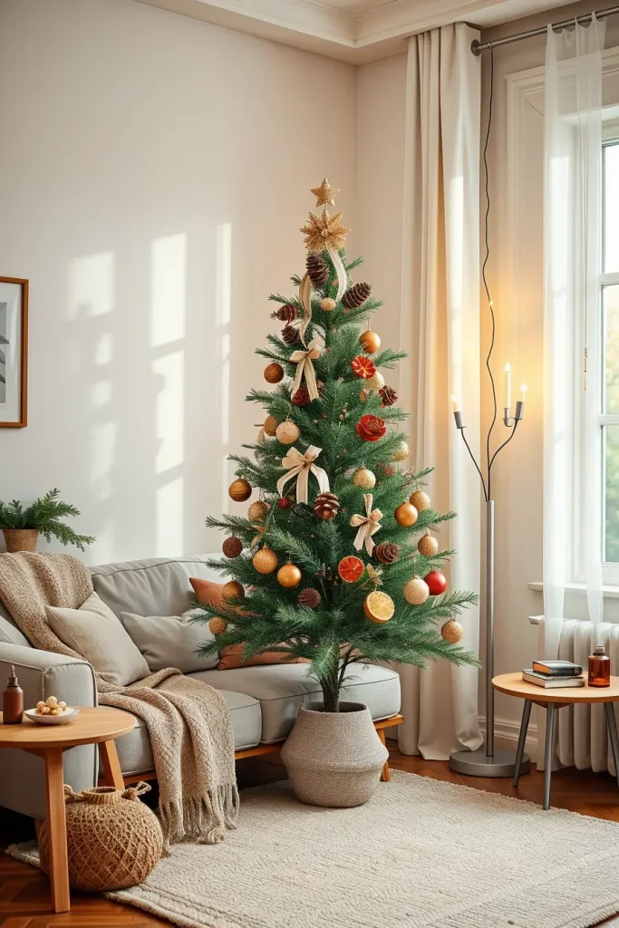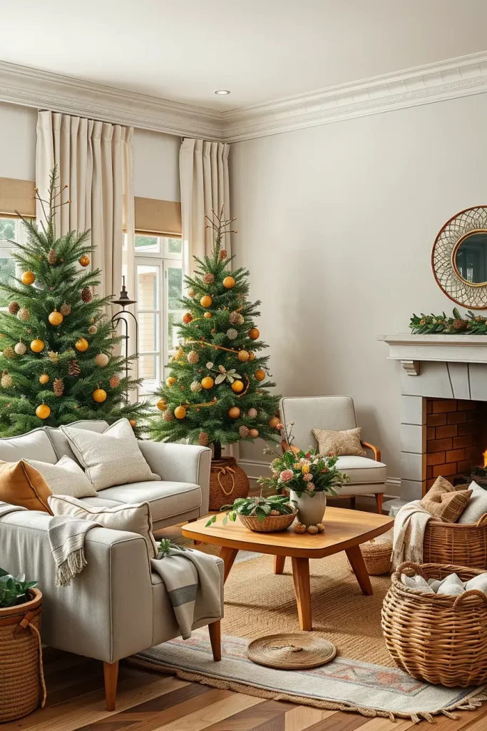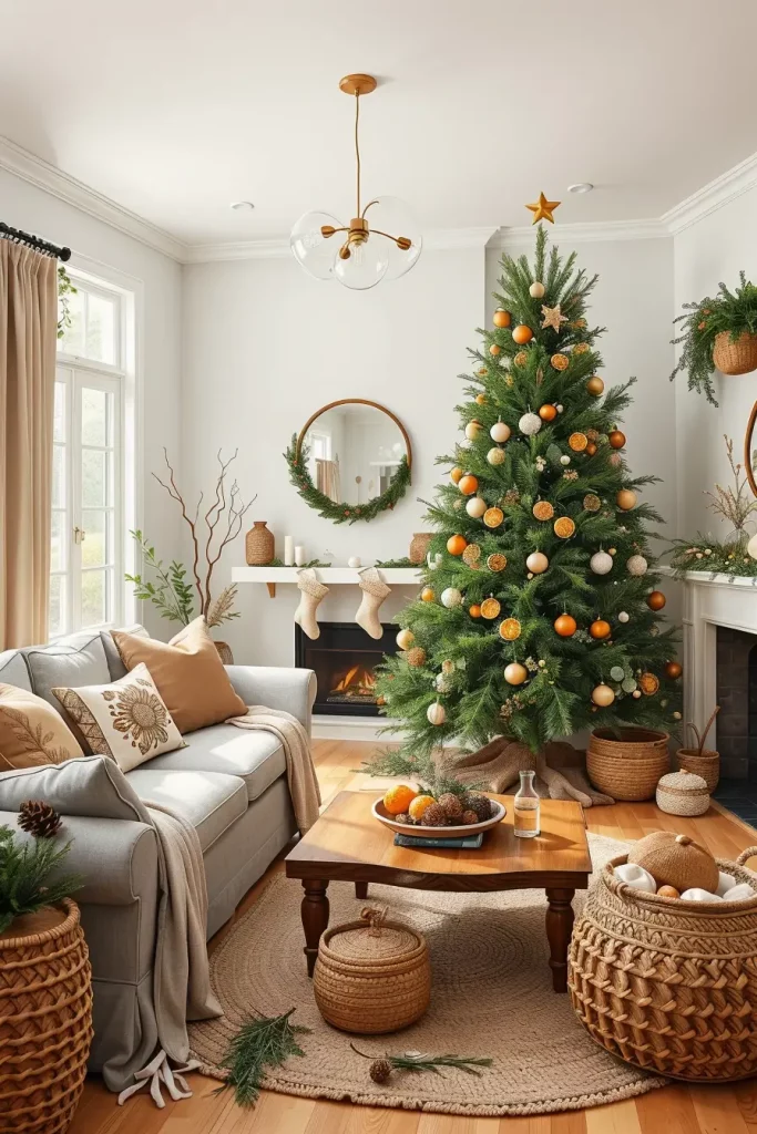 In my decorations, I generally use plain garlands such as pinecones, dried oranges slices or wooden stars. Trees can be made to look fuller with the addition of eucalyptus or olive branches as accents and to increase the texture of the tree. I usually combine this with the furniture that is inclined to natural materials wooden coffee tables, linen sofas, and woven baskets to make it even more natural.