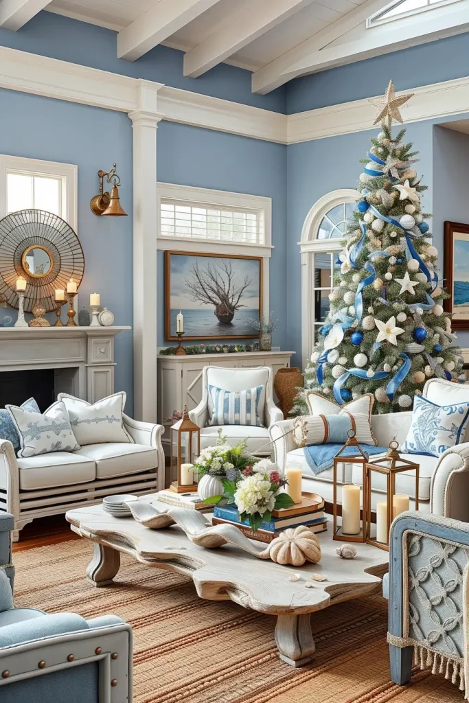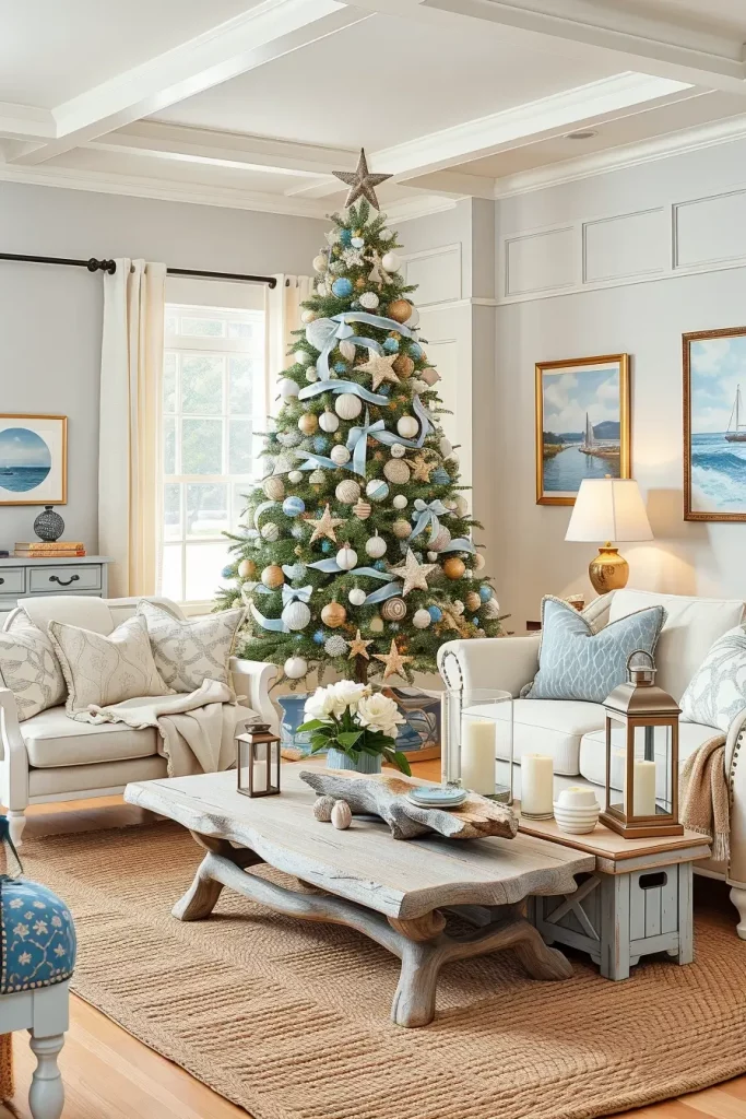 I usually trim these trees with blue glass baubles, white seashells and silver ribbons. White or light wood furniture is supplemented by woven carpeting and soft linen curtains, which add to the seaside atmosphere. It is topped off with a driftwood coffee table or a nautical piece on the walls.