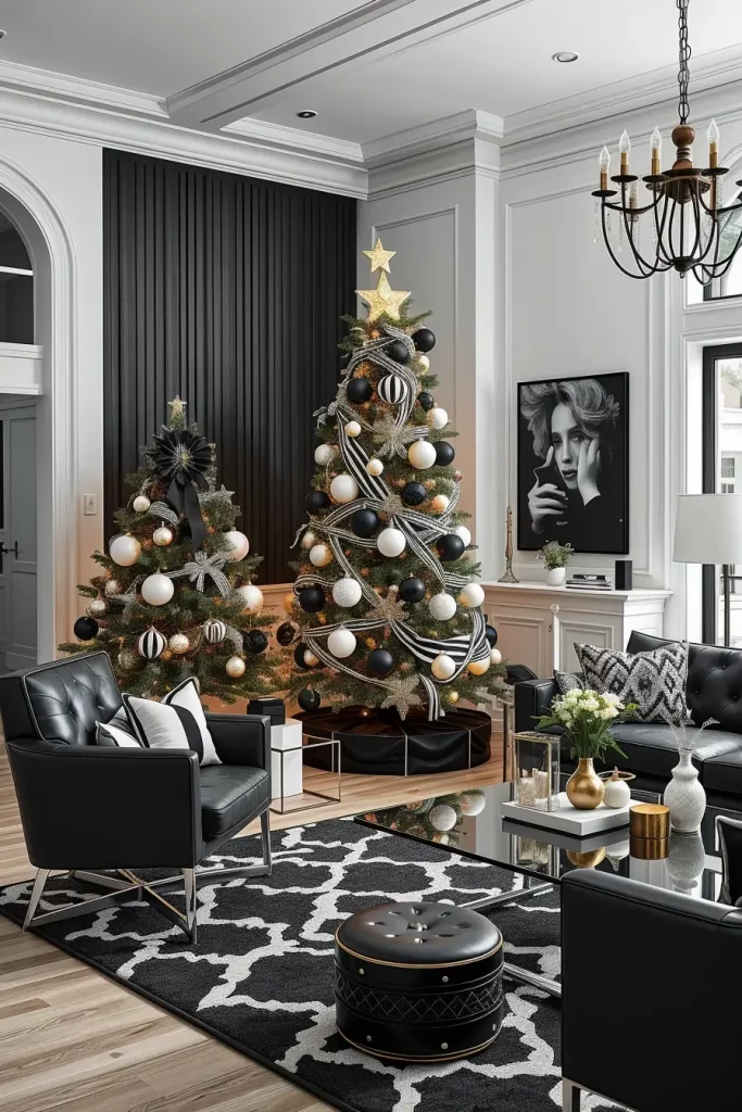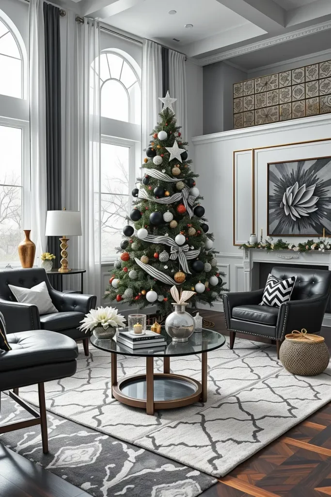 I adorn these trees with flat black baubles, shiny white decorations and checkered ribbons. The bold appearance is added with geometric rugs, seats in leather, and black-framed artworks. The table created with glass and coffee is smooth so that there is some balance on the space, and it does not look too heavy.