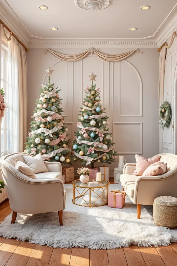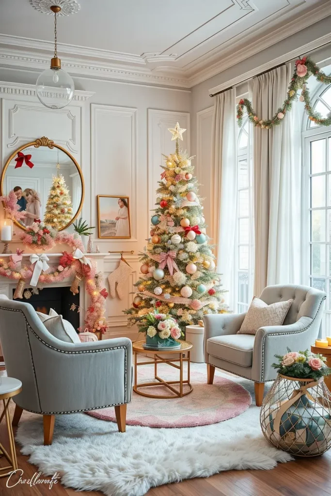 Ornaments such as blush pink, mint green and powder blue are pastel in color, creating the atmosphere. The tree is balanced by matching it with soft furnishes like velvet seats, fluffy carpets and small-lights. The airy impression can be contributed by a tree skirt of a pastel color or soft-tone curtains.