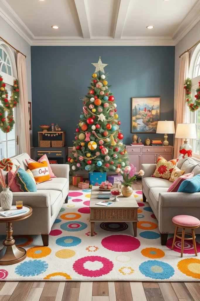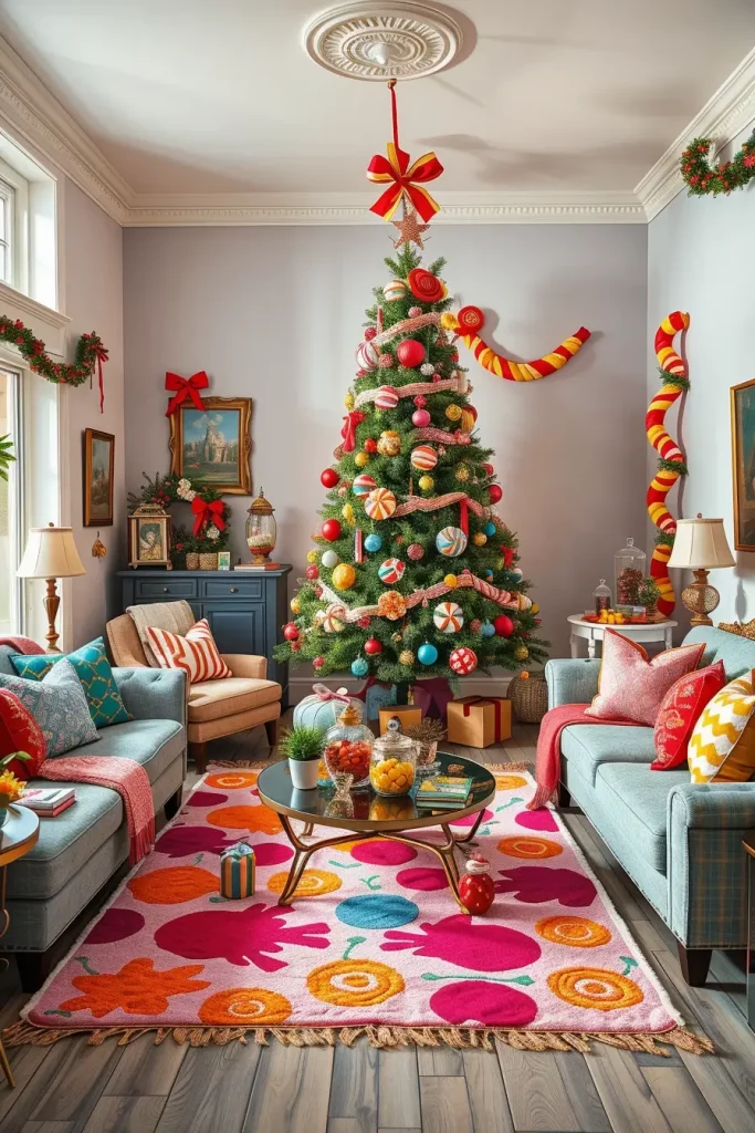 Personally, Candyland themes are popular in family rooms or playrooms. I read that advice in Good Housekeeping that suggests the use of excessively large ornaments to add drama to the image, and I have found it to be well suited to this type of style.