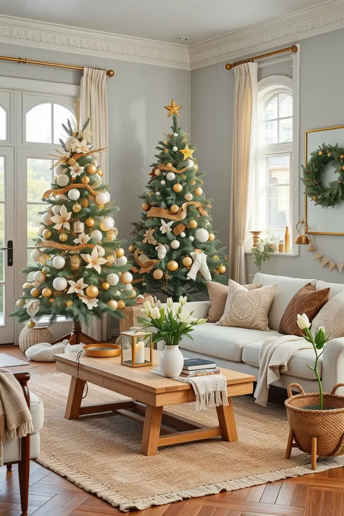 I have always felt that this style suits best in big living rooms. Veranda Magazine emphasized that metallic holiday themes are eternal since they reflect light well thus giving any interior a shine. This design was one that I have tried myself and I have always noticed that it leaves an immediate impression to the guests.