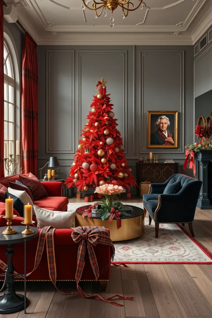 In order to balance the boldness, I prefer mixing the red-trees with black-and-white pieces of furniture or dark wood colors. The tree can be complemented with a red velvet sofa or accent chair. The color scheme is enriched with the use of gold accents (candle holders, frames, etc.) that improve the richness of the color scheme.