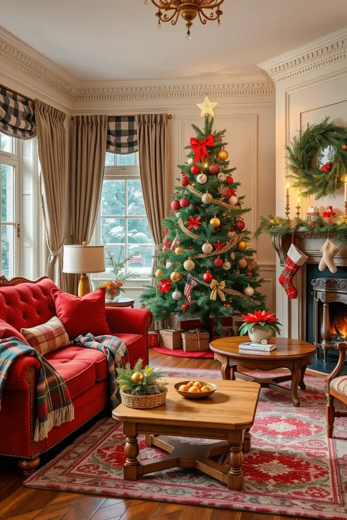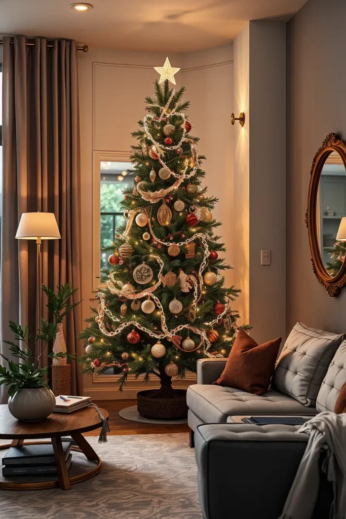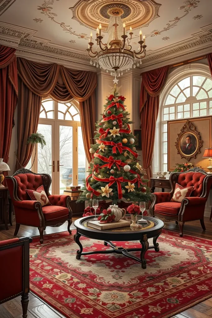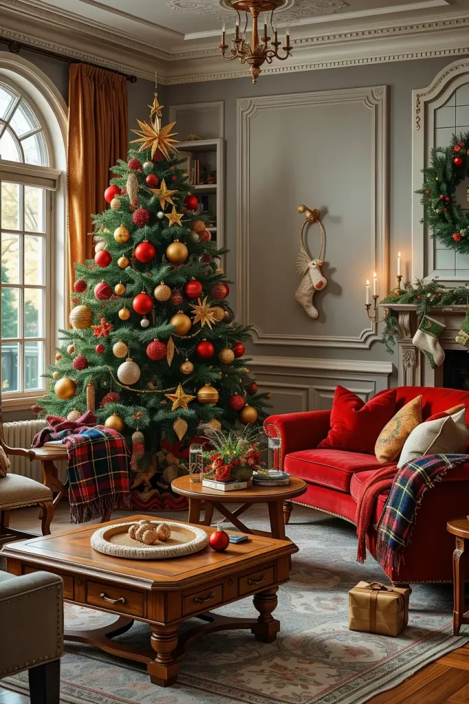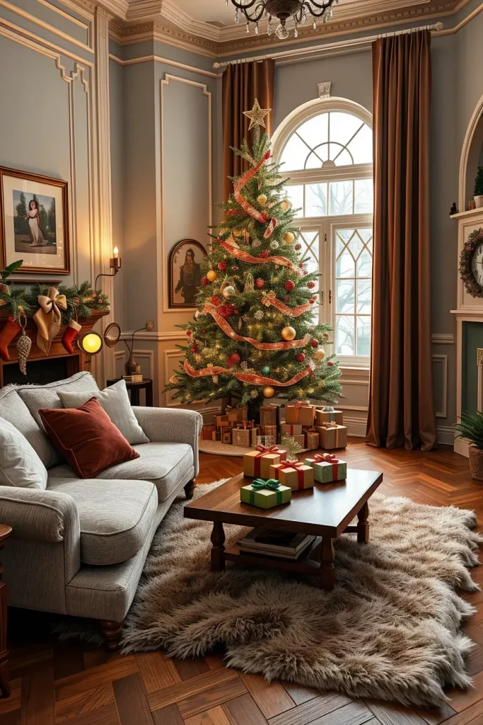 I tend to match a Victorian tree with such pieces of furniture as tufted armchairs, dark wood coffee tables, and heavy curtains either in the burgundy or emerald color. There is chandeliers or gold candleholders of crystal, which make it never too much or too little. The traditional appeal is supplemented with a Persian-style rug under the tree, which makes the room look royal.
