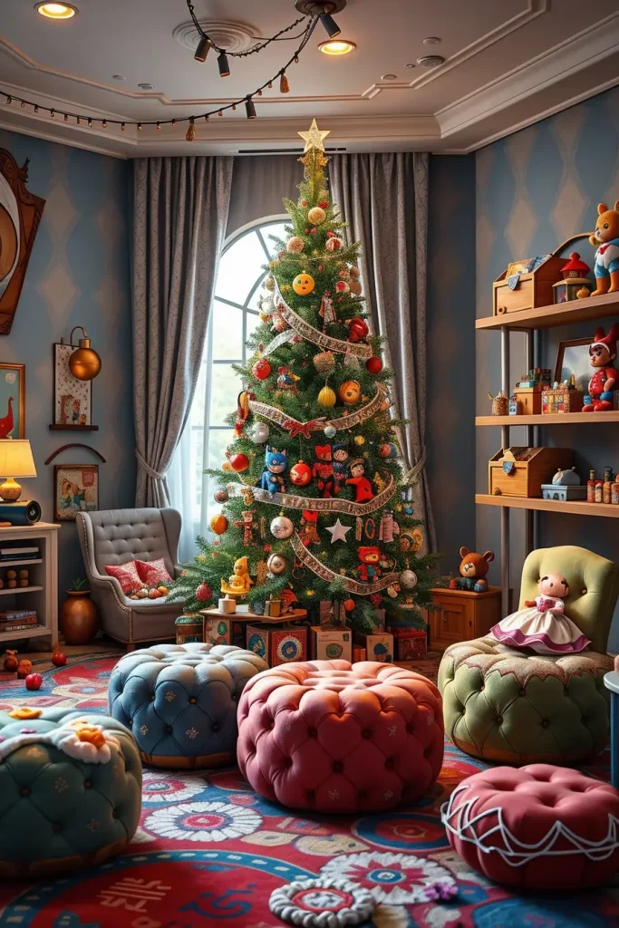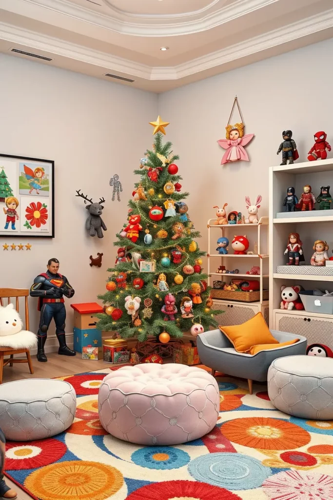 In styling such a tree, I prefer to place the tree in a playroom or family room where there are pieces of furniture that portray comfort and fun. The room is kid friendly with bean bags, colorful flooring, and low shelves on which to put toys. I would also suggest using light and shatter proof ornaments so that children can safely decorate.