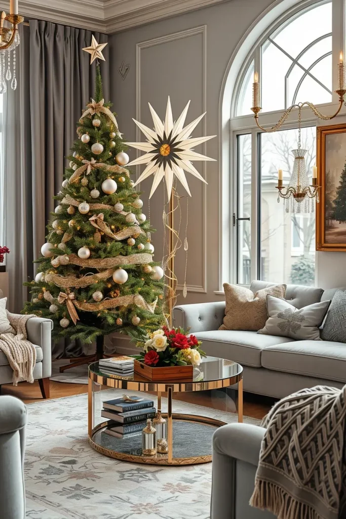 I prefer to unite a topper in a room with already existing decorations. To create a glamourous atmosphere, a metallic star is effective in combination with mirror coffee tables and crystal lighting. A large ribbon or natural item, such as a bunch of pinecones, is a beautiful addition to comfortable sofas and cozy throws when it is not as chilly or windy.