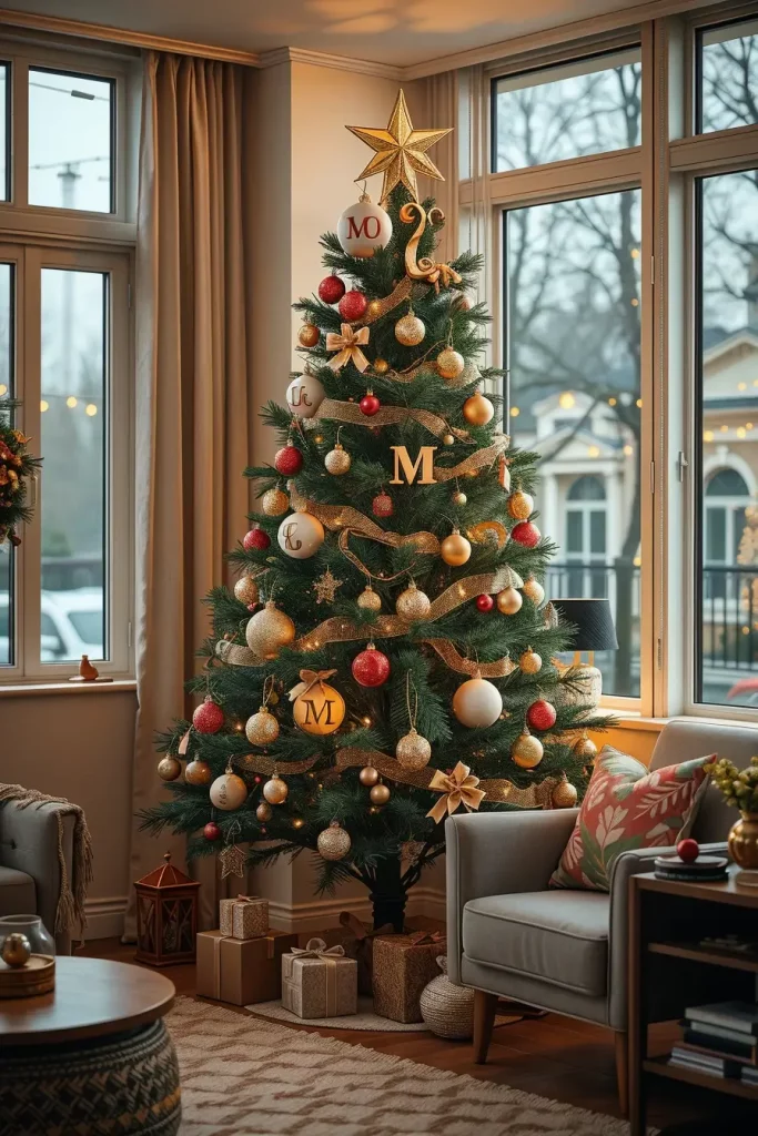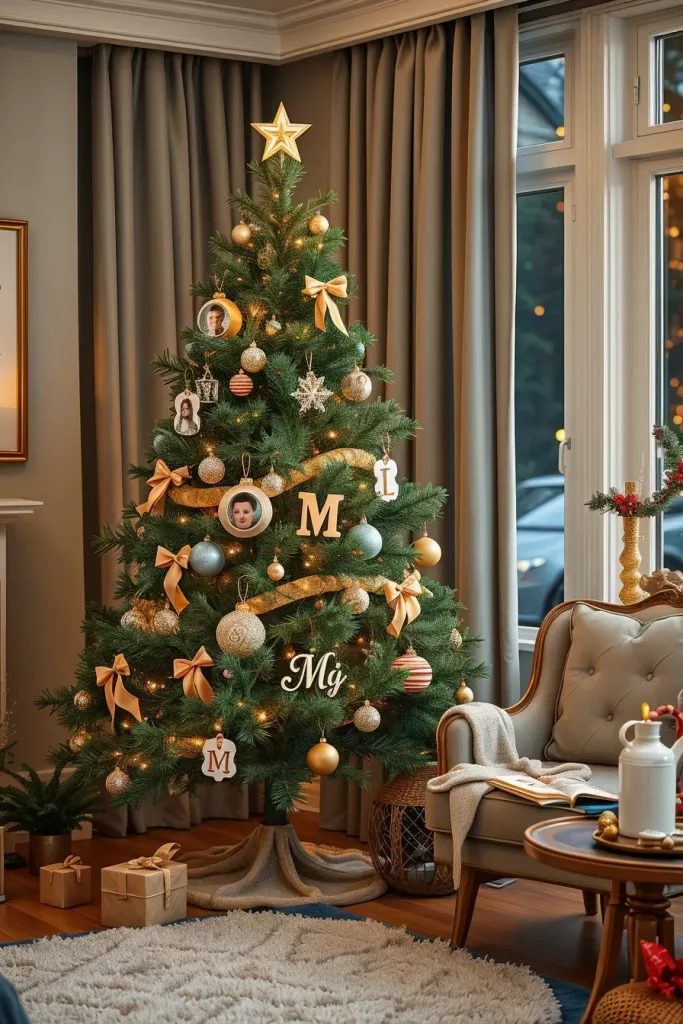 To do so, I prefer combining types of ornaments: hand-painting baubles, wood cutouts with a monogram, or metallic name tags make them interesting and deep. Embarking them at different levels at the tree is a way of counterbalancing the appearance. I usually wear them together with patterned ribbons which have soft colors either cream, gold, or navy so as to have a balance between the ornaments with the rest of the interior design. The living room is surrounded by such furniture as an upholstered armchair and a small festive side table, which makes the living room a family-oriented environment.