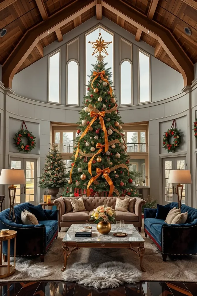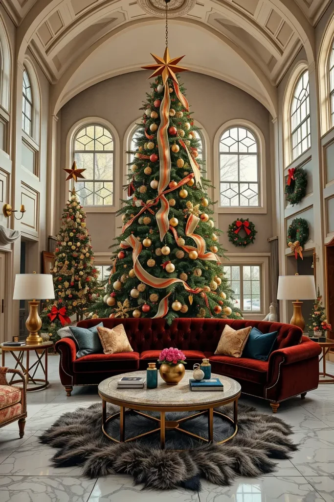 The most effective effect is when the tree is combined with the corresponding furniture. The jewel tone, deep velvet couch, a statement coffee table with brass or marble decor and tall floor lamps make the tree balanced in the environment. I also add large tops on the trees that are over-sized such as a metal star or cascading ribbon to add balance to the big design. Faux fur or thick knit finishes served as tree skirts are a perfect finishing to the base.