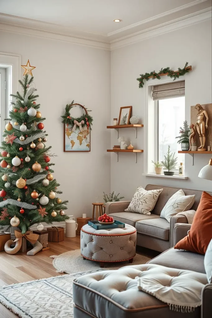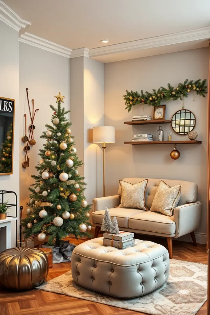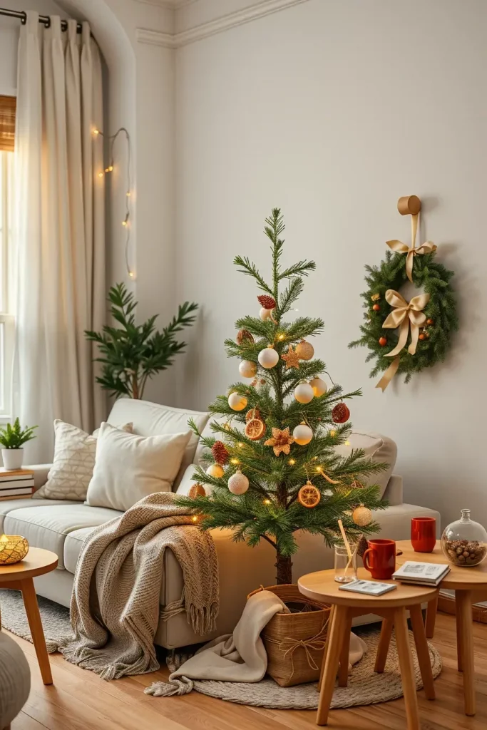 I usually tend to select narrow trees and combine them with multipurpose furniture such as ottomans or benches that serve as decor accessories. Even the wall shelves with mini garlands or lights will be expensive without occupying the floor. Furniture in small rooms would have been well matched by neutral colored furniture with the tree bringing the focus.