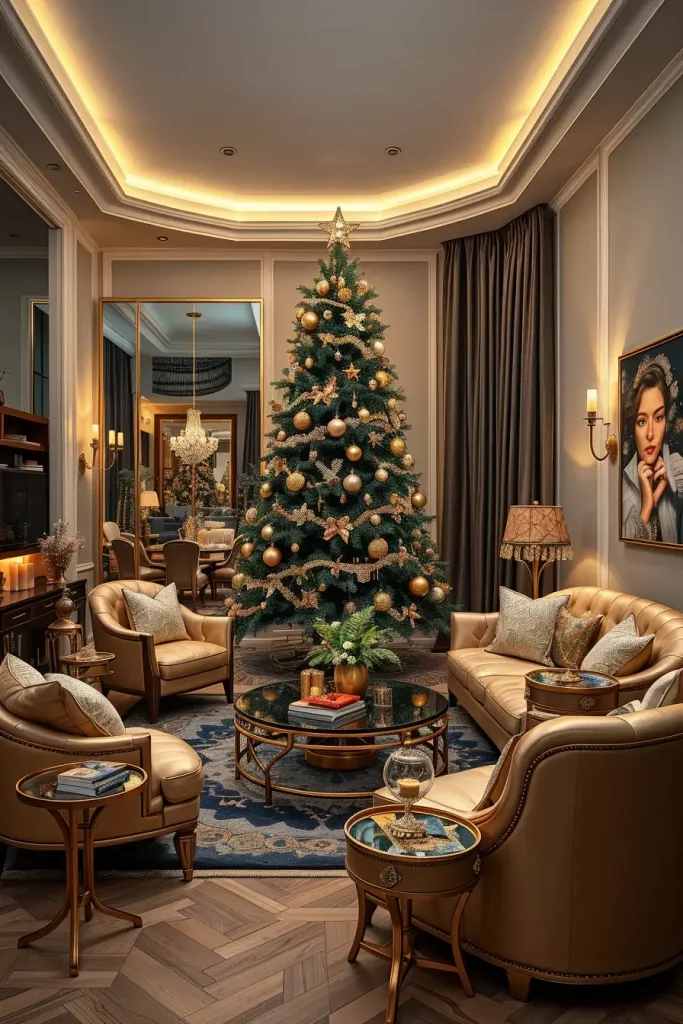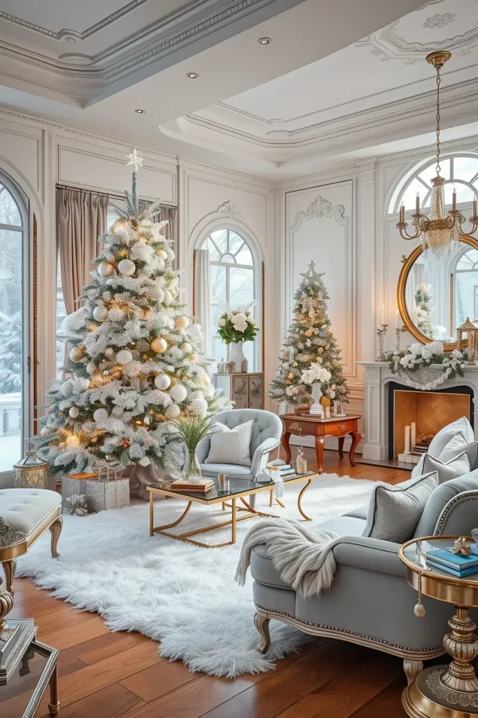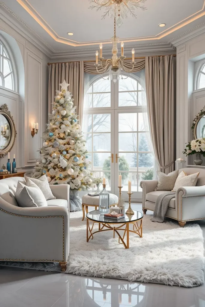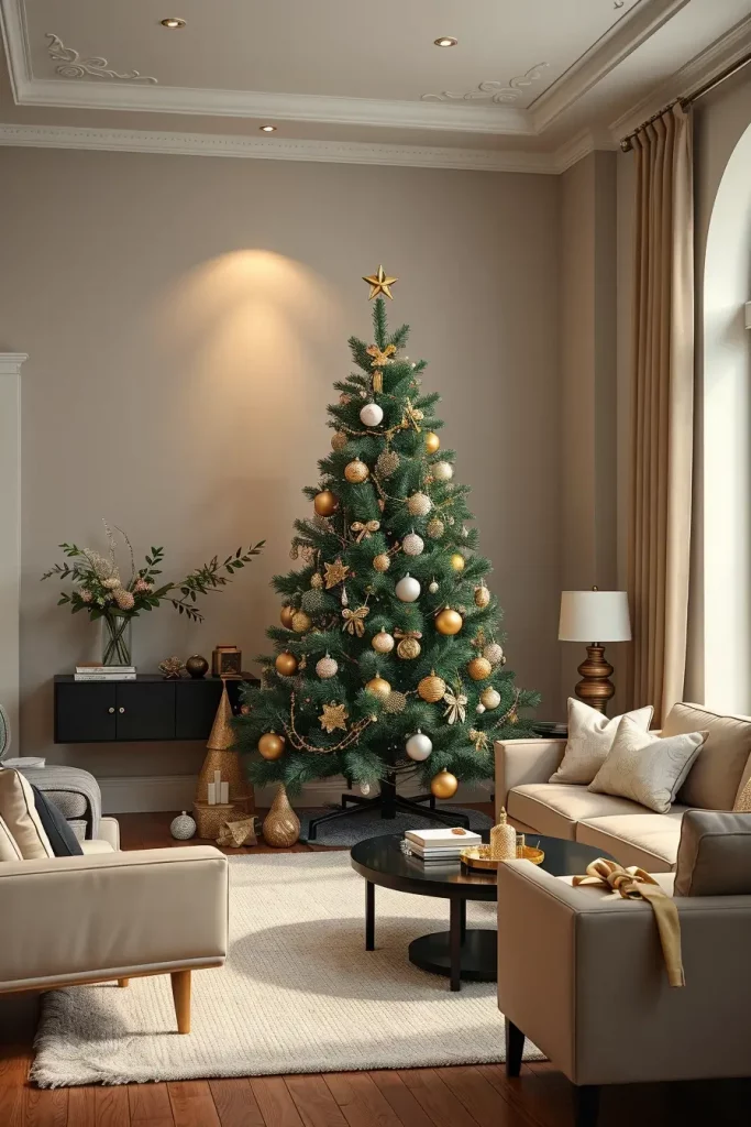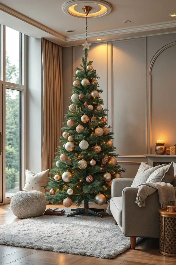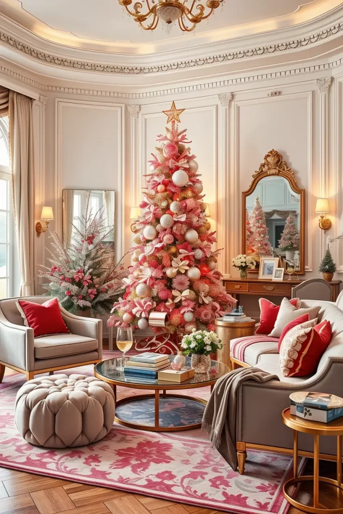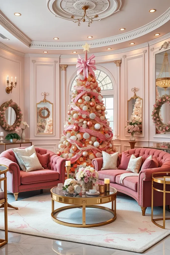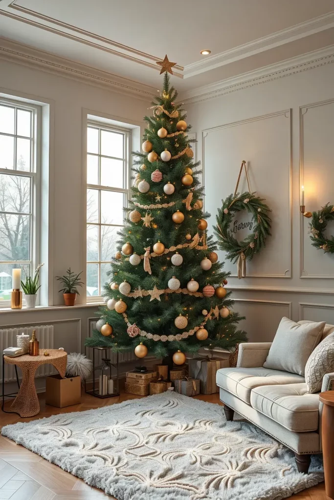I would use rose gold decorations, metallic ribbons, and garlands made of soft blush to make the look balanced. The combination of the tree and white/cream furniture, velvet cushions, and glass decorations is one of the elements that contribute to high-end editorial appearance. This arrangement is graceful and cozy when well-dressed, and more a couture Christmas than a kitsch one.