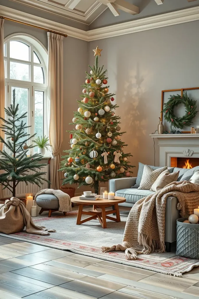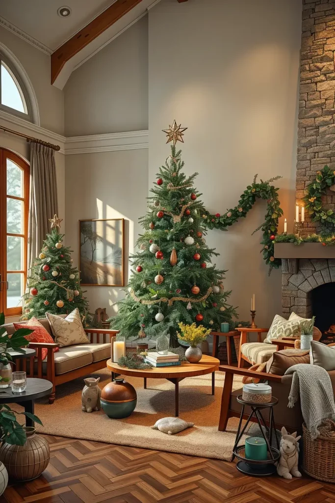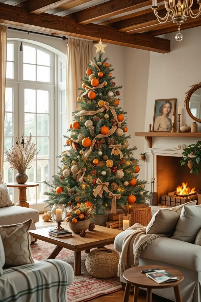 In practicing the style of such trees, I would rather apply the use of burlap ribbons, dried oranges, cinnamon sticks as well as greenery woven on the branches. The floor may be a woven basket with linen upholstery, earth-coloured cushions and soft ambient lighting may be used to decorate the surrounding. This natural palette renders the whole room down-to-earth and friendly.