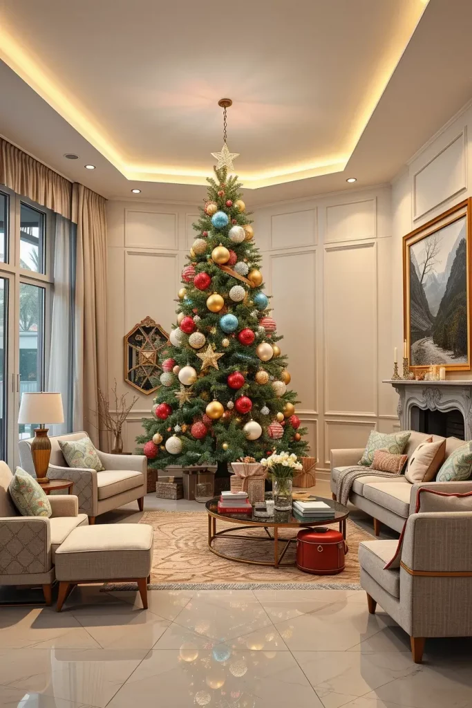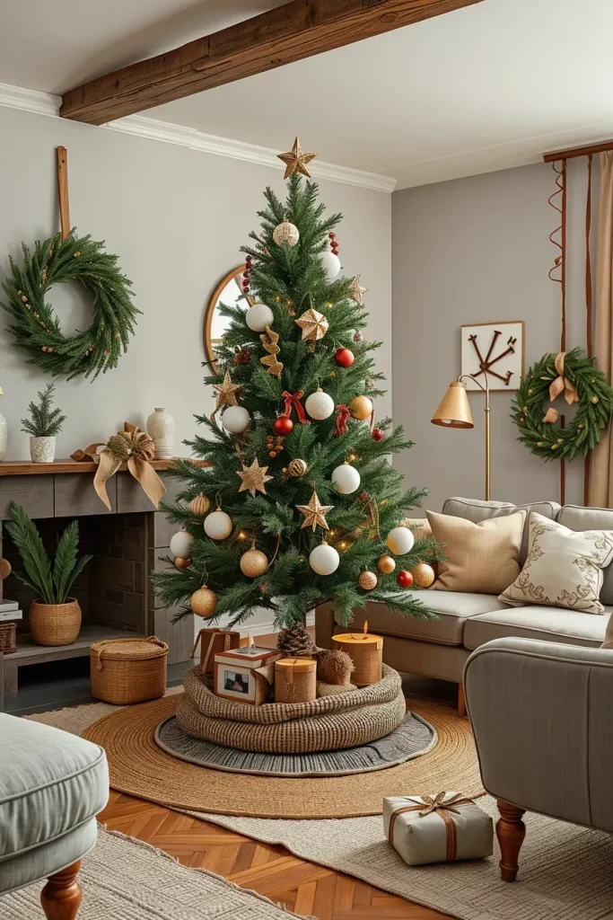 I myself had been inspired by suggestions made in Architectural Digest that pointed to the term texture layering as one of the most luxurious and accessible decor trends of 2025. The use of different finishes such as brushed metals, natural fibers, etc. provide the tree with visual rhythm without the tendency to overload the room.