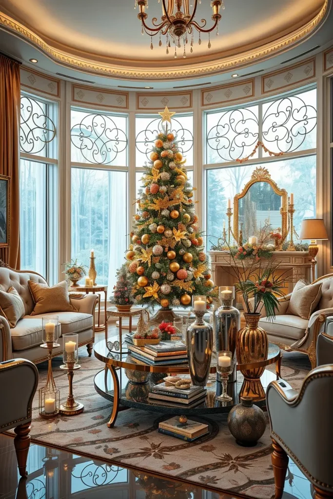 I tend to add mirrored coffee tables, glass vases and metal-framed furniture when designing around a metallic tree. These elements reflect light back and forth into the room producing a three dimensional appearance. Even the small spaces can be made luxurious with the help of metallic garlands and sequin ribbons as well as reflective ornaments.