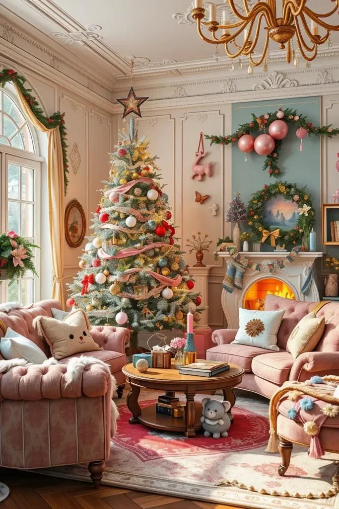 The pastel trend of the Christmas tree is introducing the soft and dreamy look to the holiday decor of 2025. I like this appearance particularly in smaller or feminine interiors where delicacy is required. The soft pinks, mint greens, and baby blues are mixed into a perfect gelling of modern spaces to make the whole room look like a winter haven.