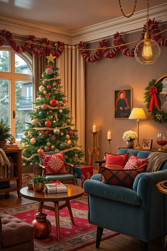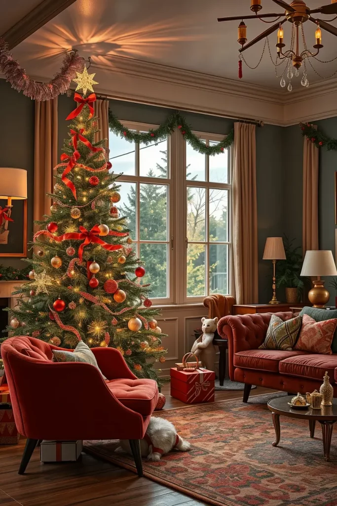 To furnish the vintage-themed space, I would use the tree along with the furniture which would reflect the period, possibly a curved velvet sofa, a brass lamp, or a walnut coffee table. The use of such color palettes as red, teal, and gold usually form a lighthearted, traditional appearance.