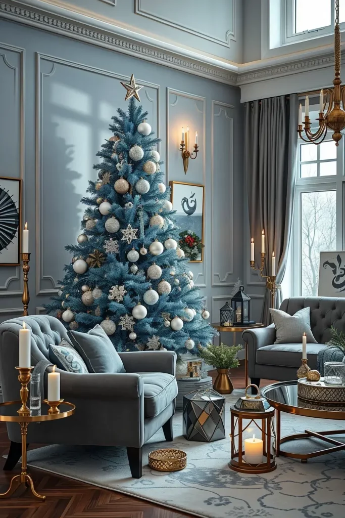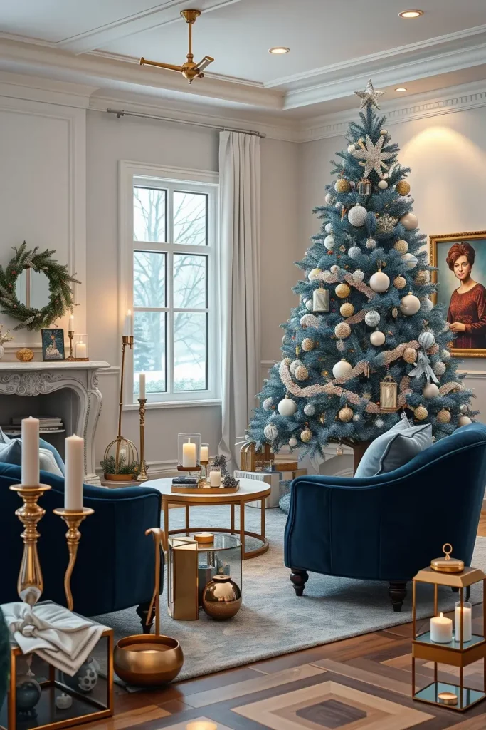 I frequently combine blue trees with silver and other white garlands, and glass decorations in my designs to make them look more peaceful. This piece of furniture is complemented by pale gray or navy furniture, making the room look whole and wintery. Imagine velvet armchairs, plush wool throws, metallic candle holders, which are twinkling with lights.