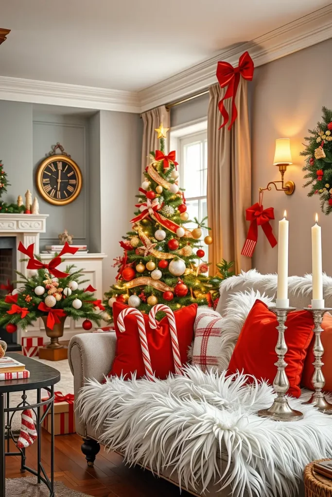 I tend to use red velvet ribbons, white ornaments and striped candy canes when styling. The addition of a white faux fur dress, glass candle holders and the red accent pillows on the surrounding furnishings help to put the theme together very well. The opposition is vivid but at the same time harmonious– the ideal combination of energy and calm.