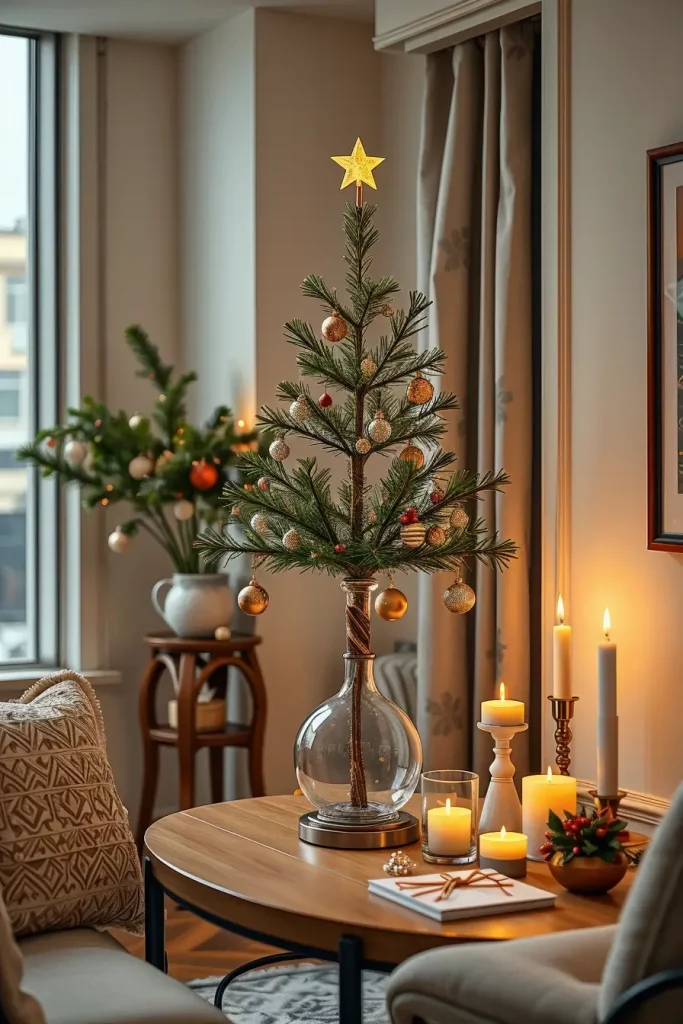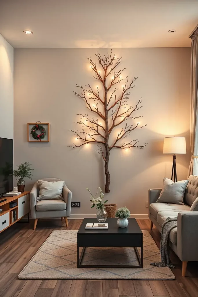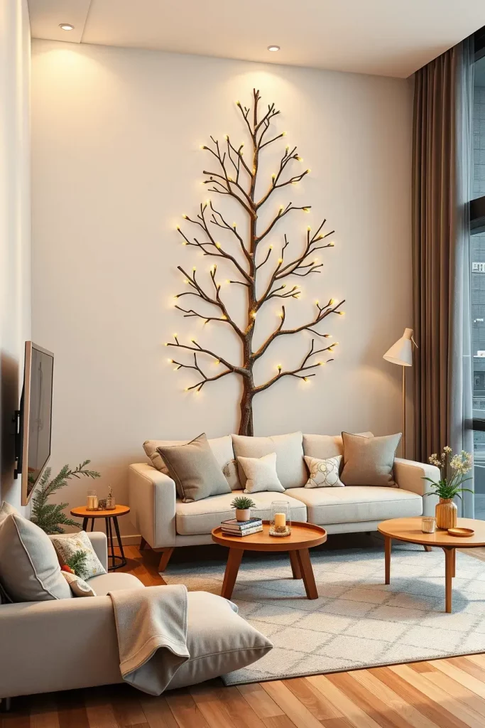 I have also worked with minimalist wooden frames in the shape of trees that are frequently covered with LED fairy lights, pinecones, and eucalyptus garlands in my personal designs. In small apartments, I would suggest that they should have a plain wall and above the branch tree with neutral ornaments. A hanging Christmas tree made of light metal or recycled wood would be an interesting centerpiece above a dining table or console entrance and make the place look whimsical.