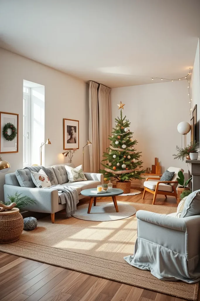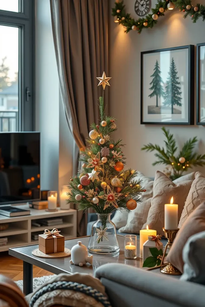 In a small space setup, I make use of functionality and proportion when I work. An artificial tree that is narrow in shape and mounted on the wall, or a half-tree, does not occupy much floor space and does not diminish the impact. In decoration, I choose light and airy ornaments, LED lights on a string, and reflective material that increases the brightness of the room. To create more space under the tree, adding a mirror or a metallic tray can also be helpful to enable the illusion of the presence of more space.